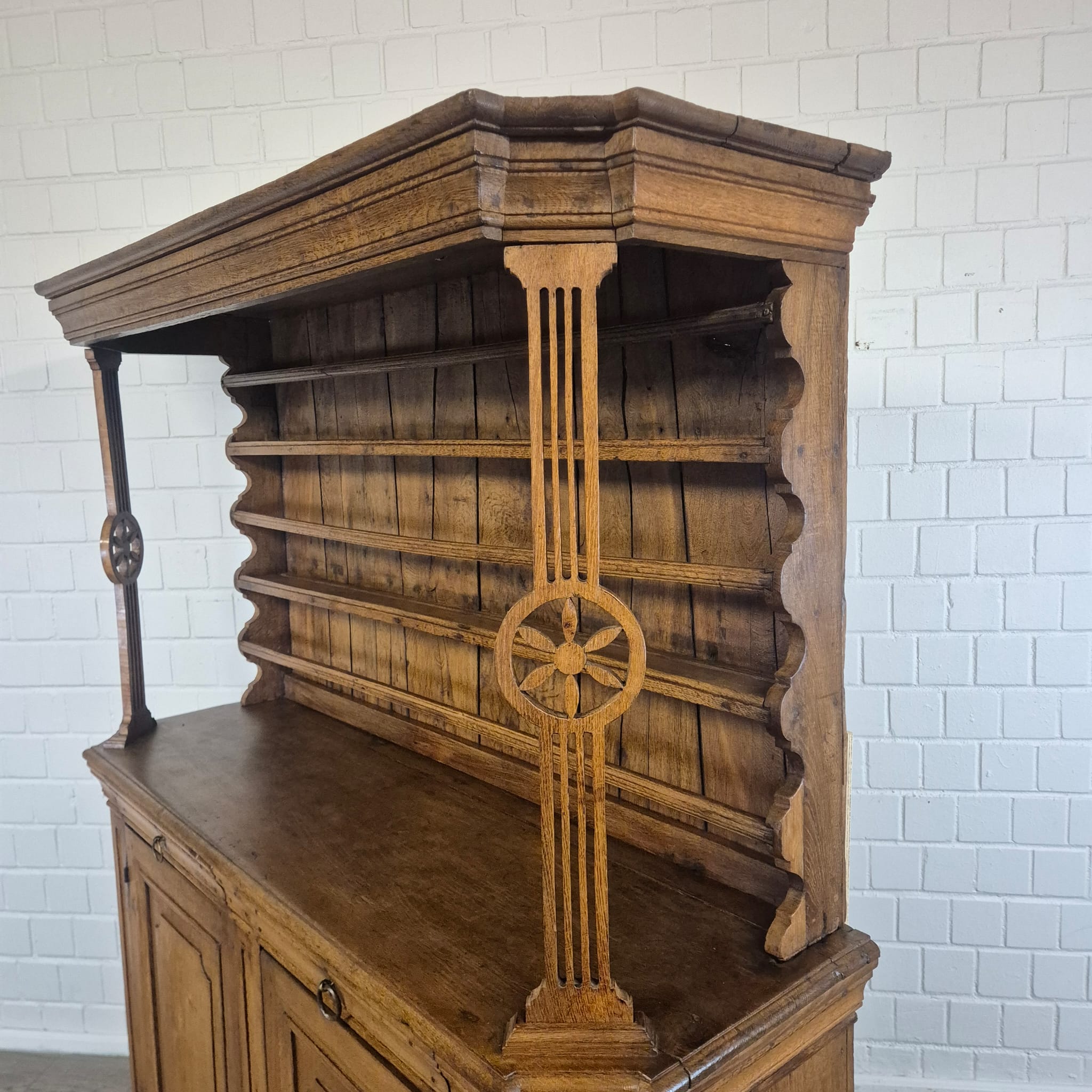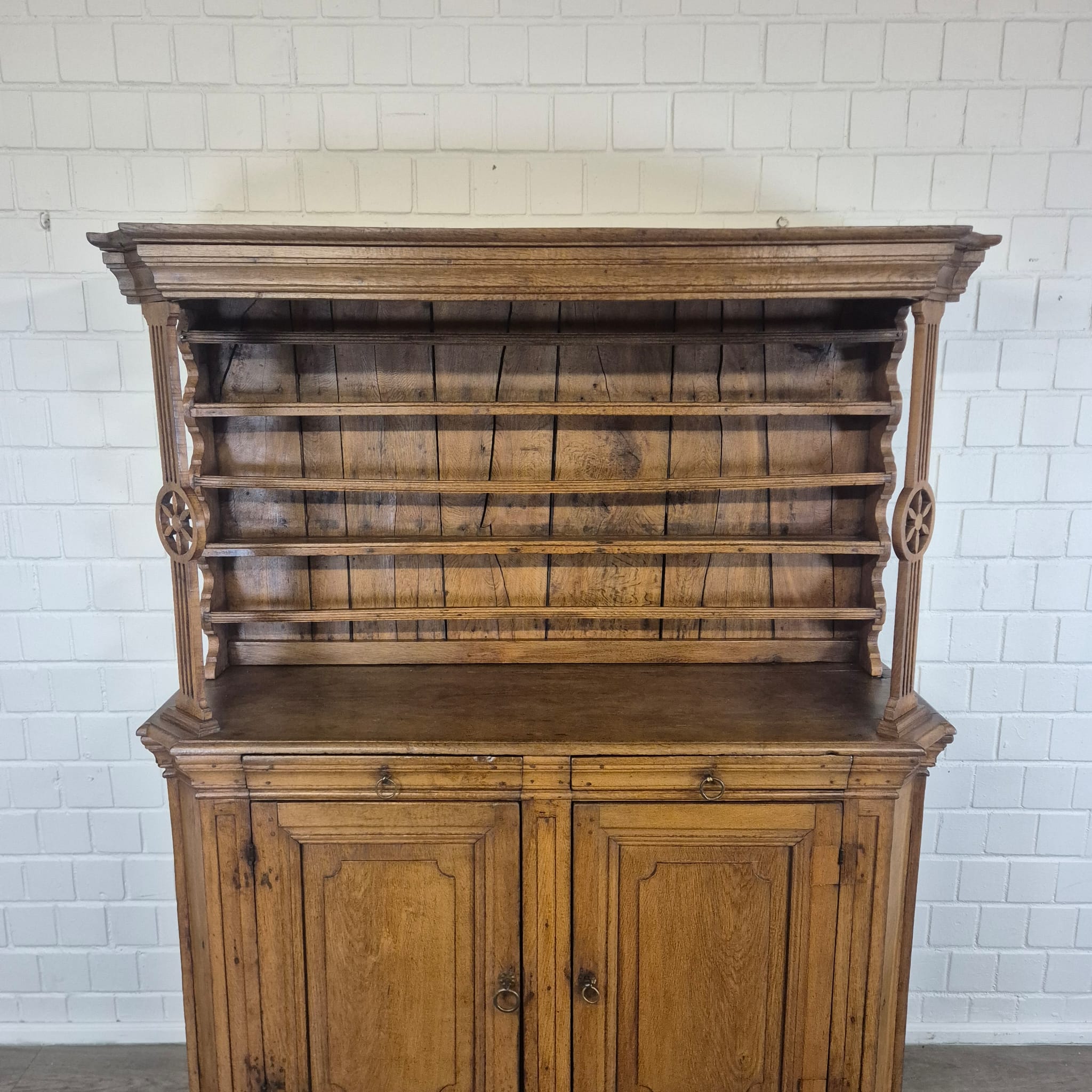 Restored Baroque cabinet made of solid oak (waxed) from circa 1760. The cabinet is in good condition and has minor signs of use. Can be disassembled (in 2 parts).