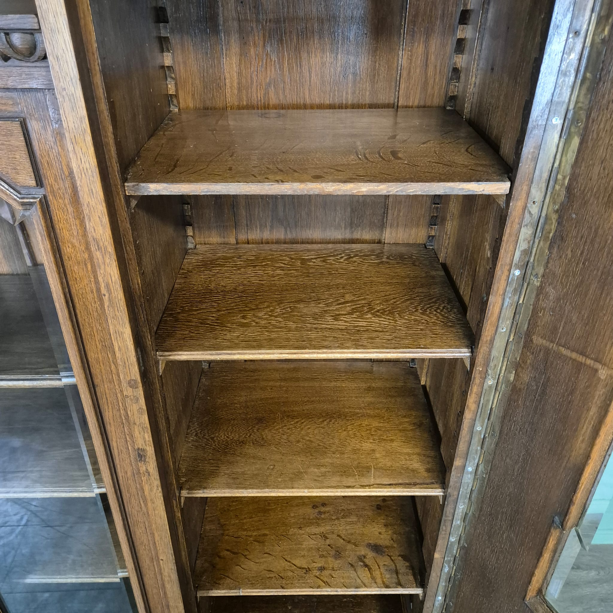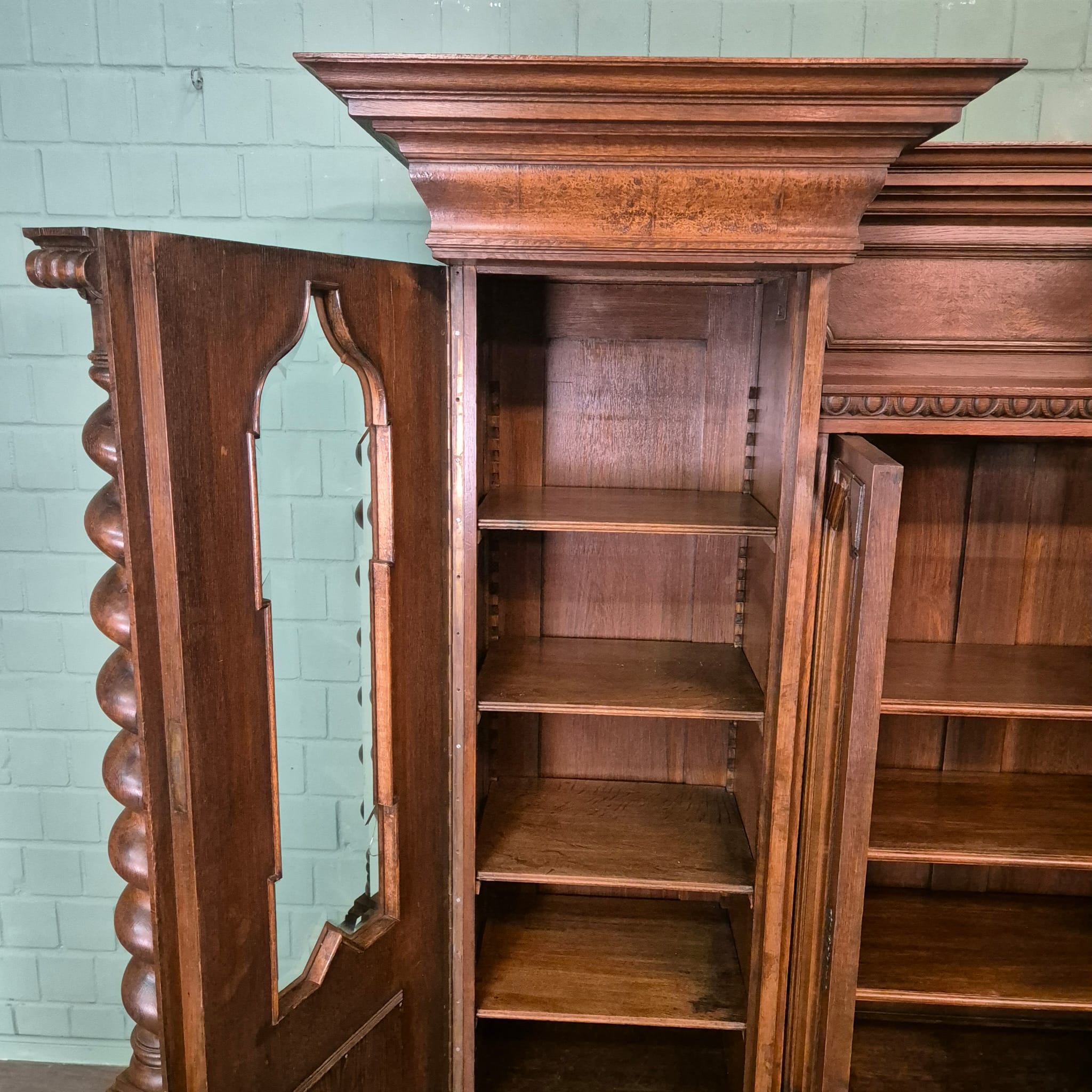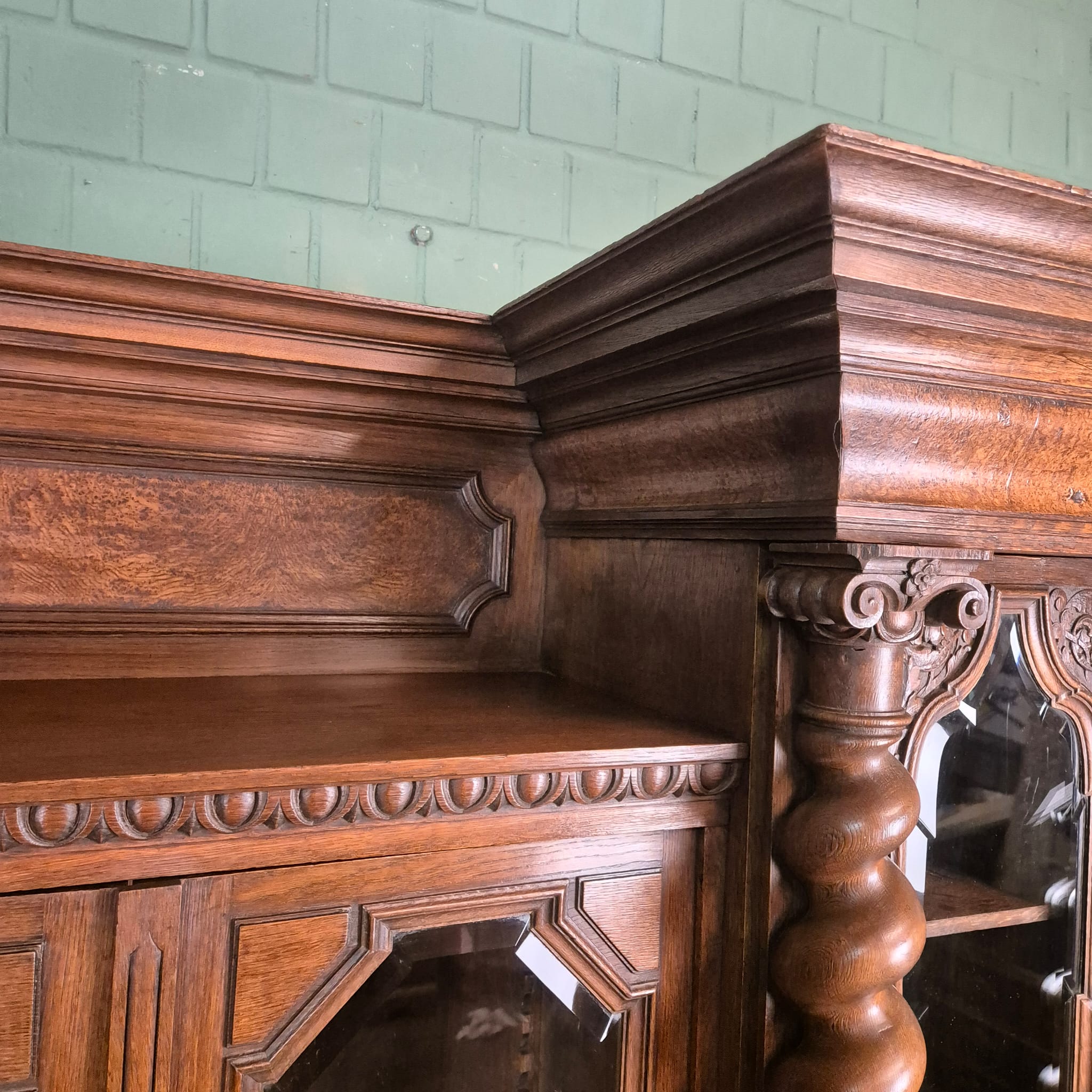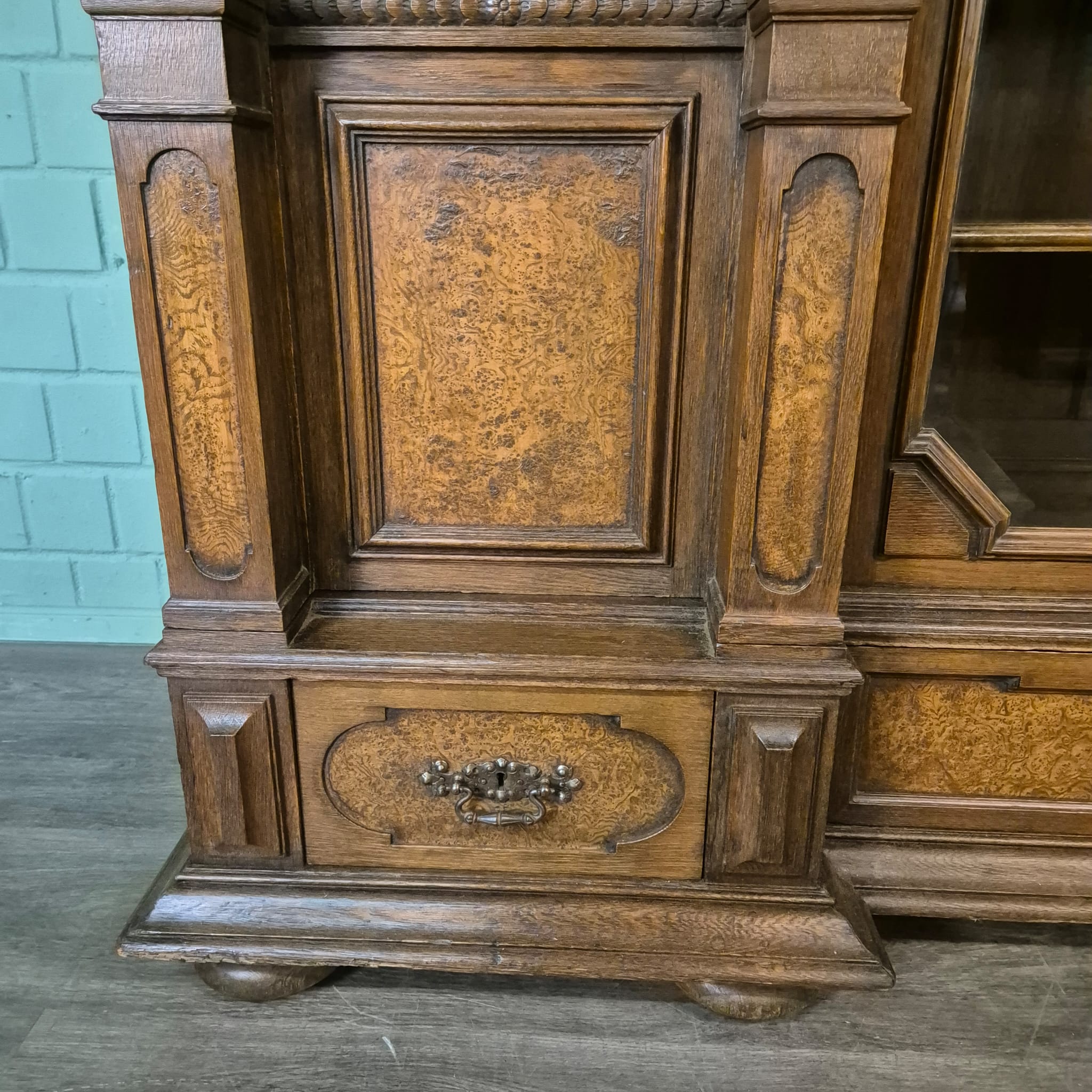 Restored Neo-Baroque cabinet made of solid oak (waxed) from circa 1890. The cabinet is in very good condition and has minimal signs of use. Dismountable (10-piece).