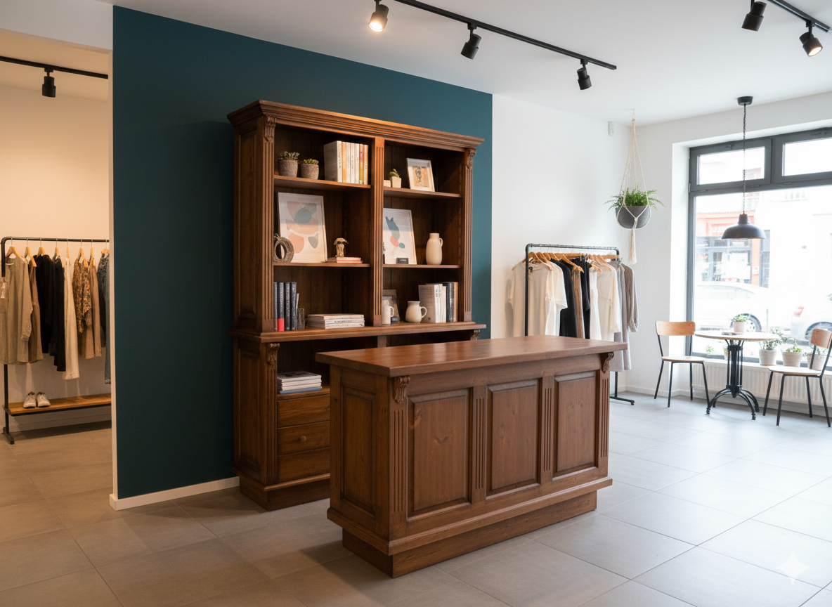 The combination of a cabinet and a sales counter model Yvonne Marrón made of solid wood impresses with its stylish elegance and elaborate workmanship. The combination of nostalgic look and modern functionality is suitable for all shop fittings and many other applications. The furniture is supplied fully assembled and are immediately ready for use.