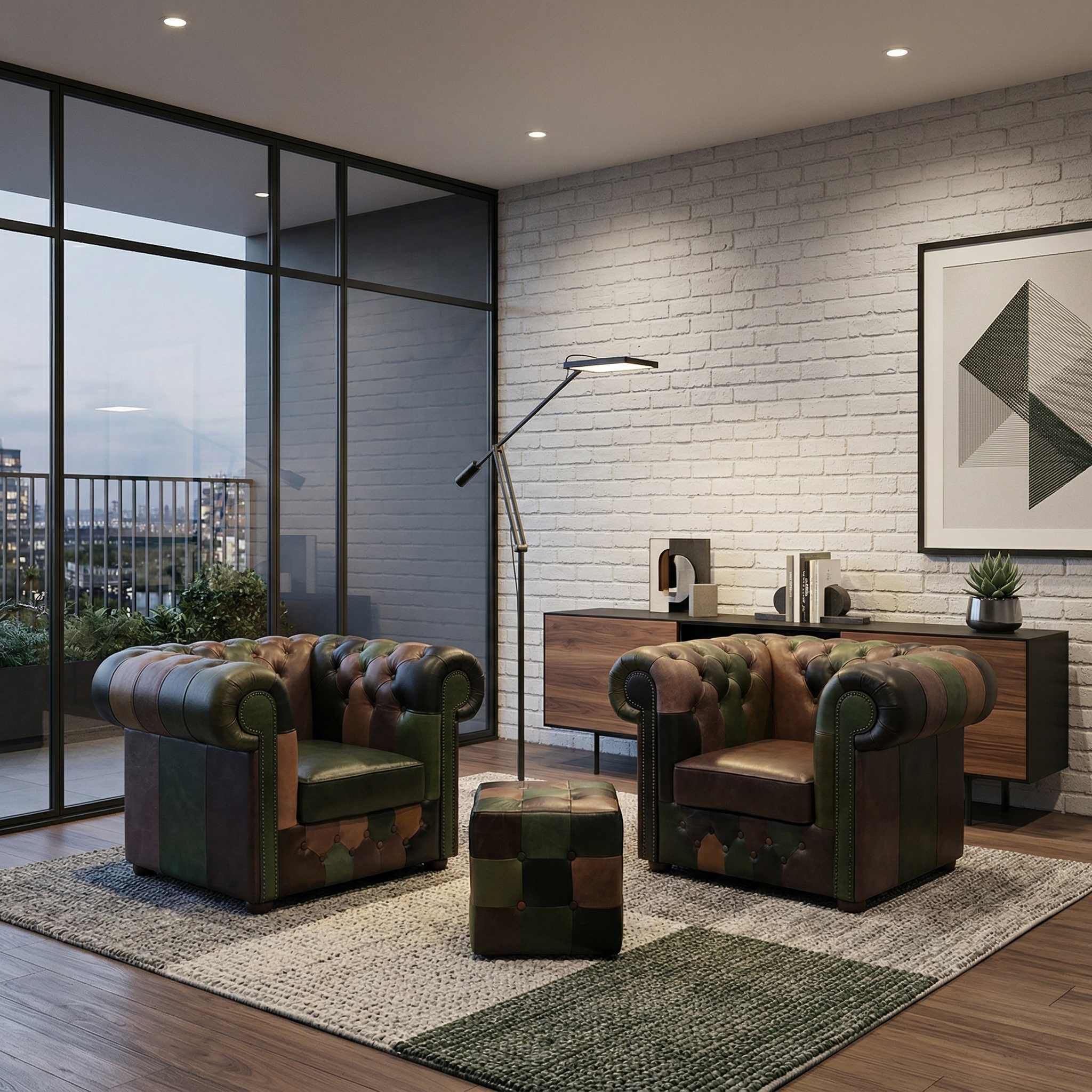These Chesterfield armchairs and footstools, "Jungle Model", are real eye-catchers and give your home a unique charm. Crafted from high-quality genuine leather, these armchairs impress with their exceptional patchwork design.