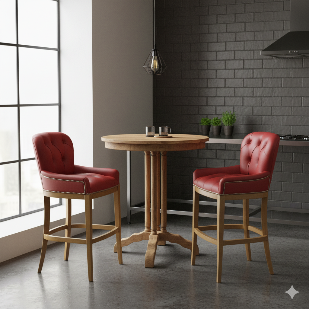 High-quality barstool upholstered in genuine cowhide leather in Chesterfield style.