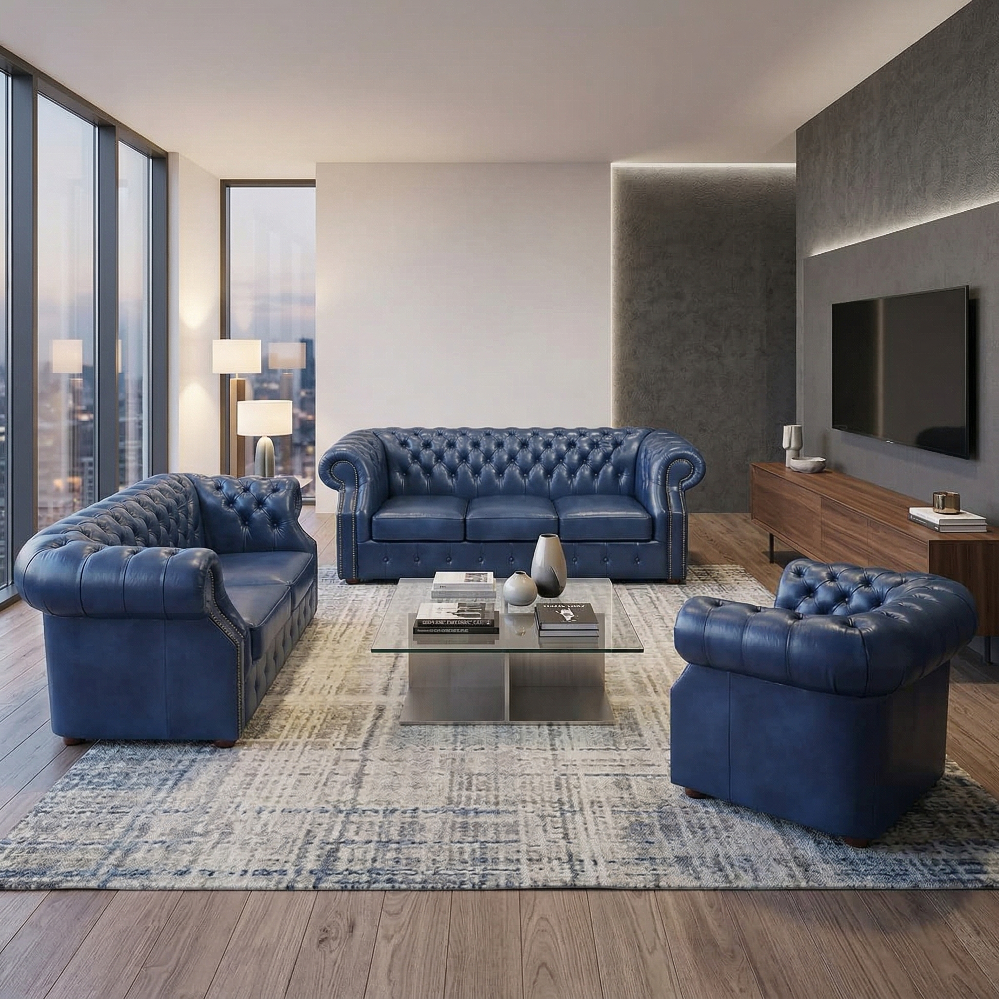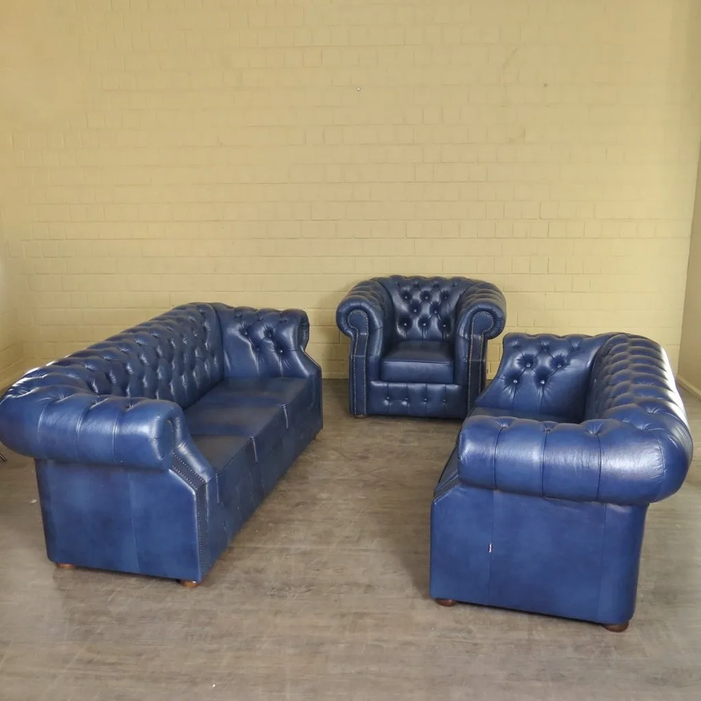 Chesterfield Sofa Set Blue 3-2-1 Leather
