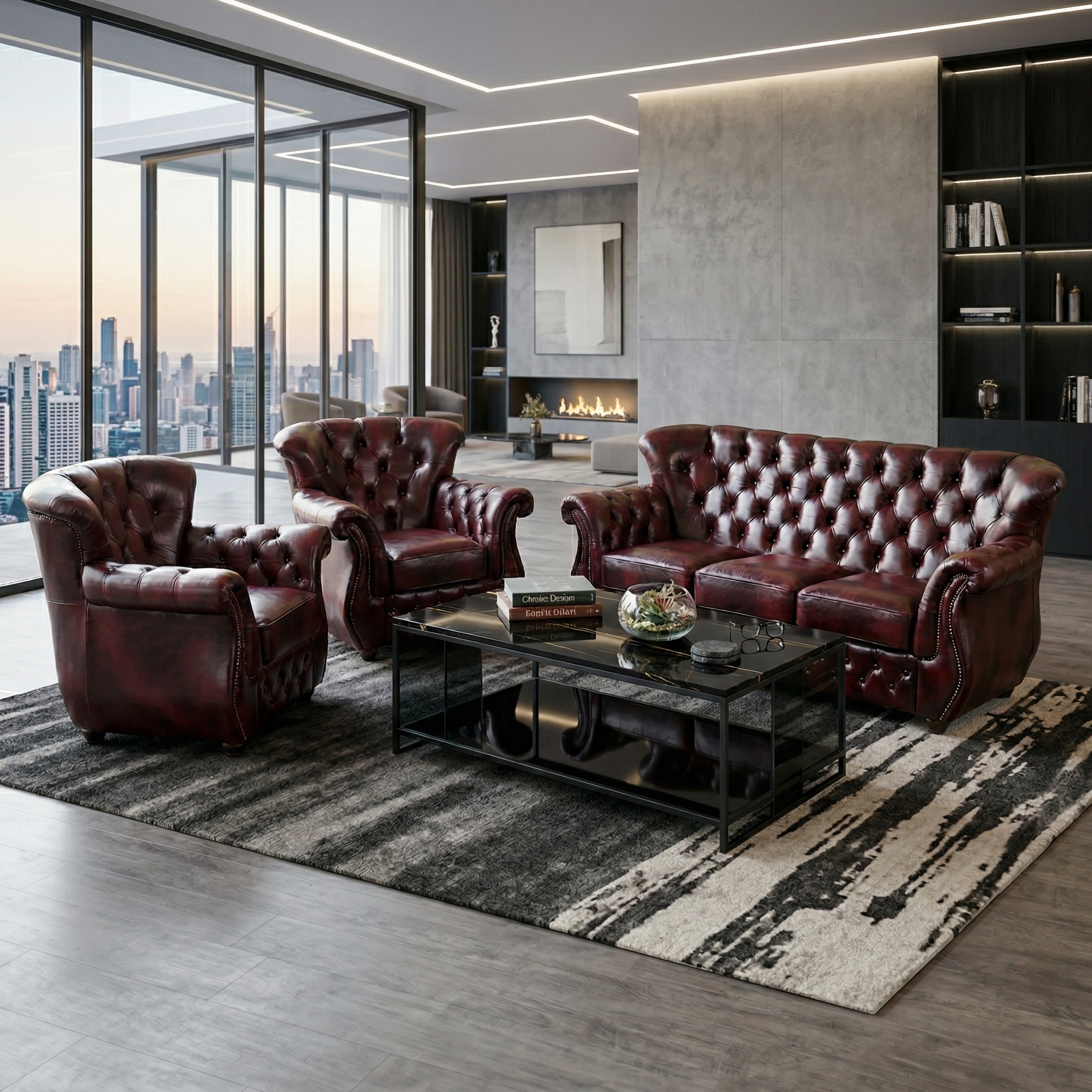 Chesterfield Couch Red-Black 3-1-1 Leather