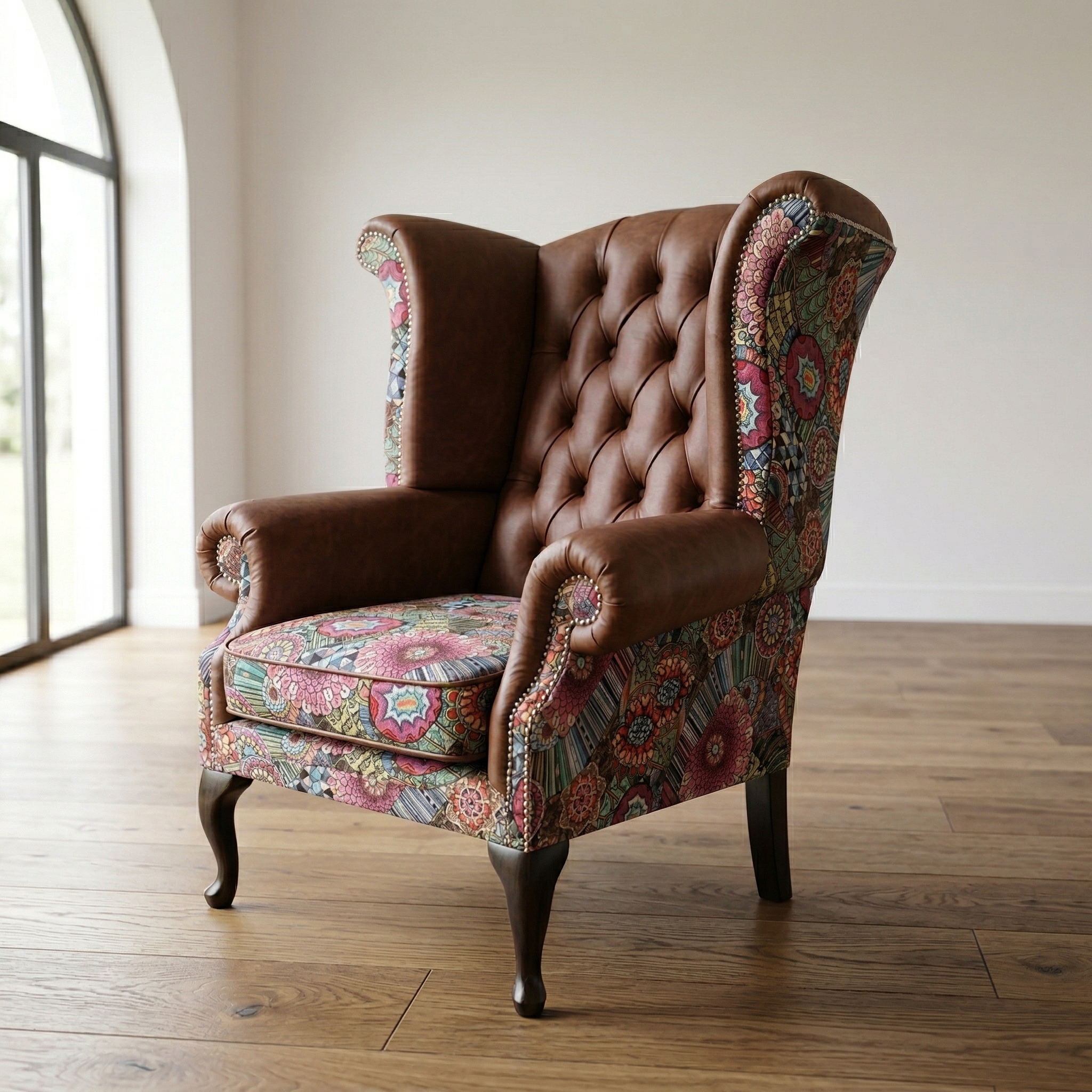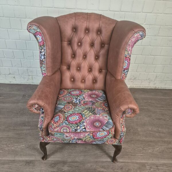 Eye-catcher with floral motif: The seat and the outside of the ear cushions are covered with a colorful fabric with a beautiful floral pattern in vibrant shades. This unique detail creates a cheerful and individual contrast to the classic leather.