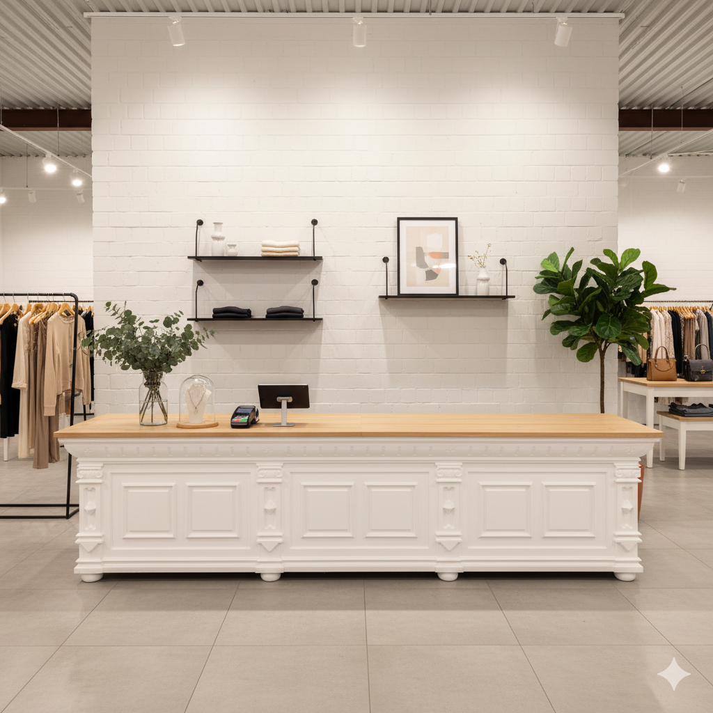 Counter made of solid teak. The combination of nostalgic look and modern functionality is suitable for all shop fittings and many other areas of application. The counter is delivered fully assembled and is therefore immediately ready for use..