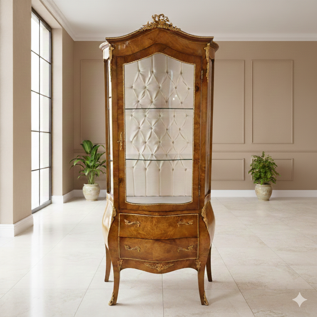 Stylish display cabinet in baroque style with 2 glass shelves, gold fittings and interior lining. The walnut veneered display cabinet is fitted with curved glass.