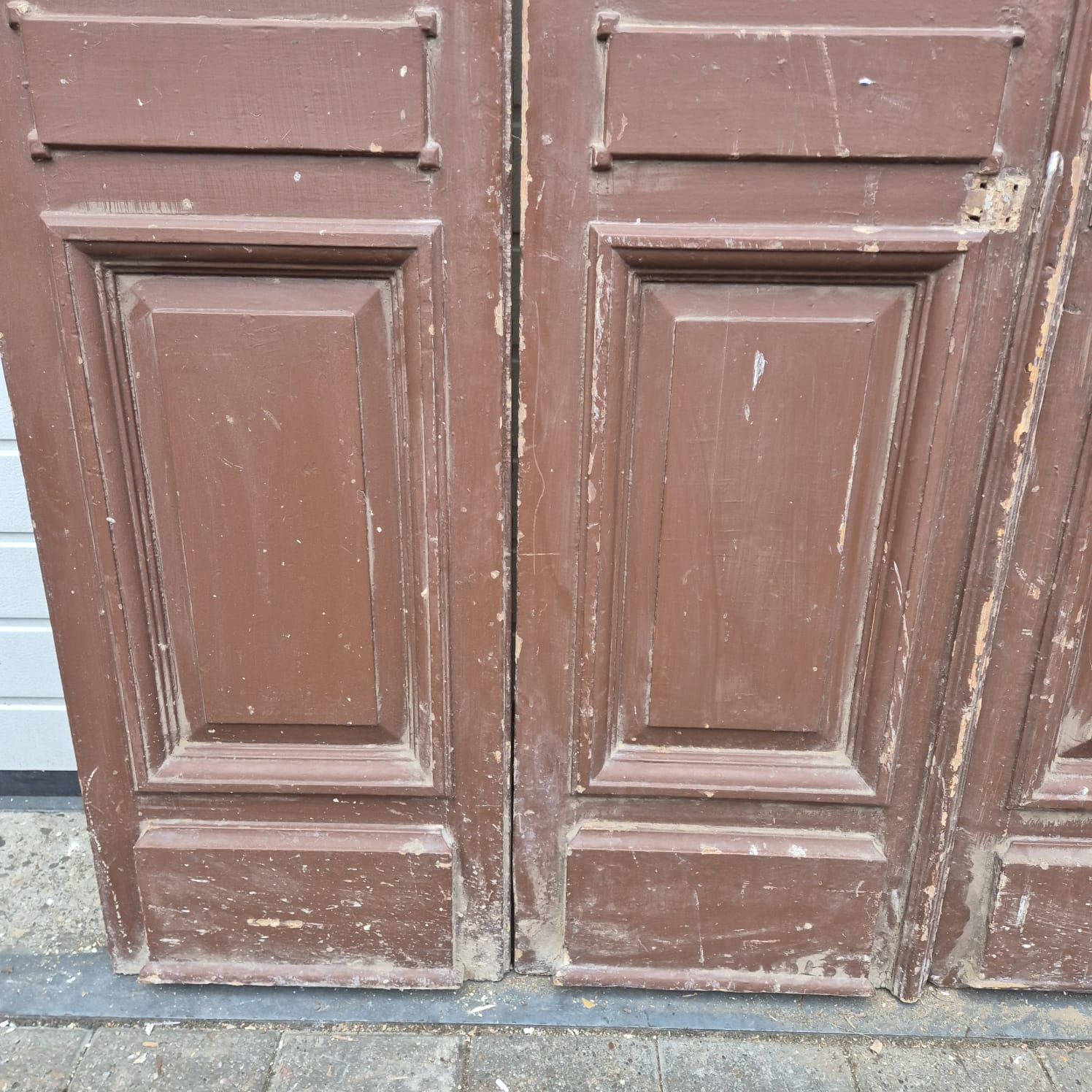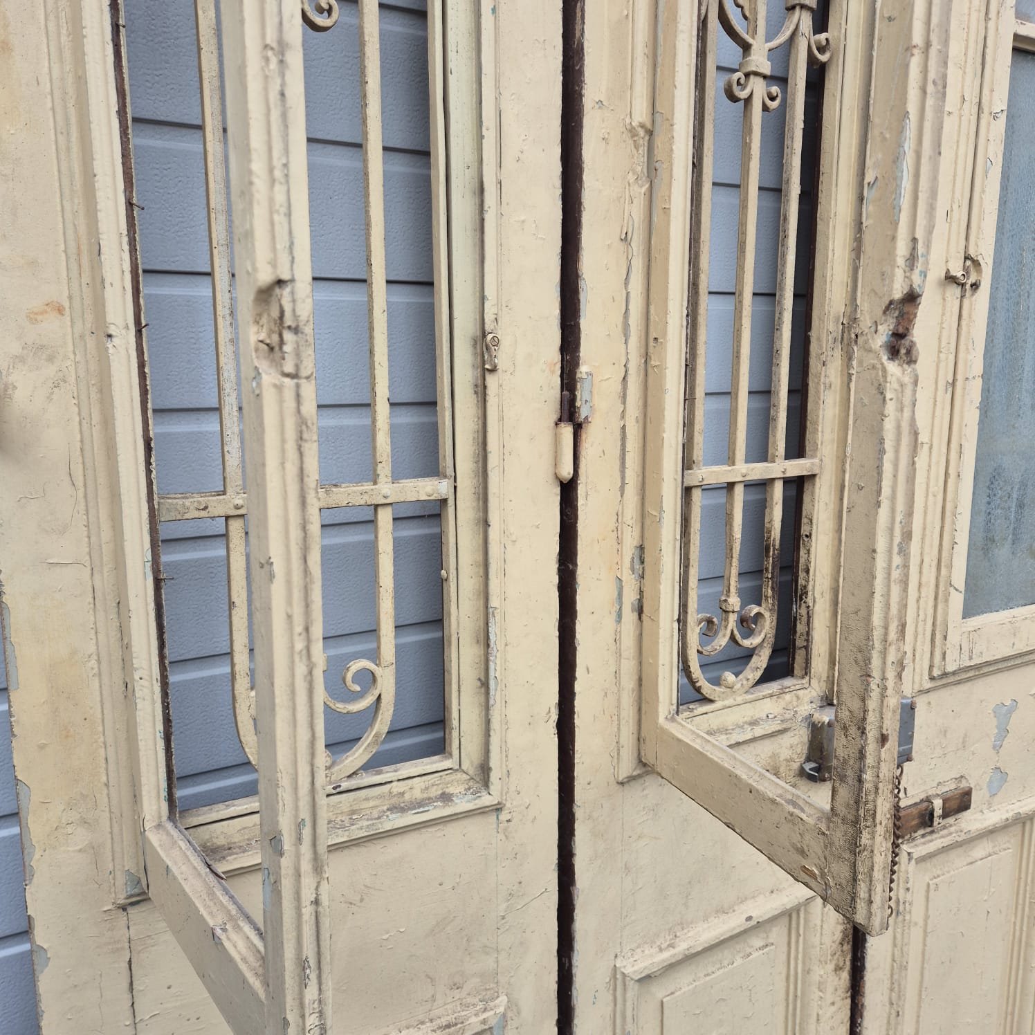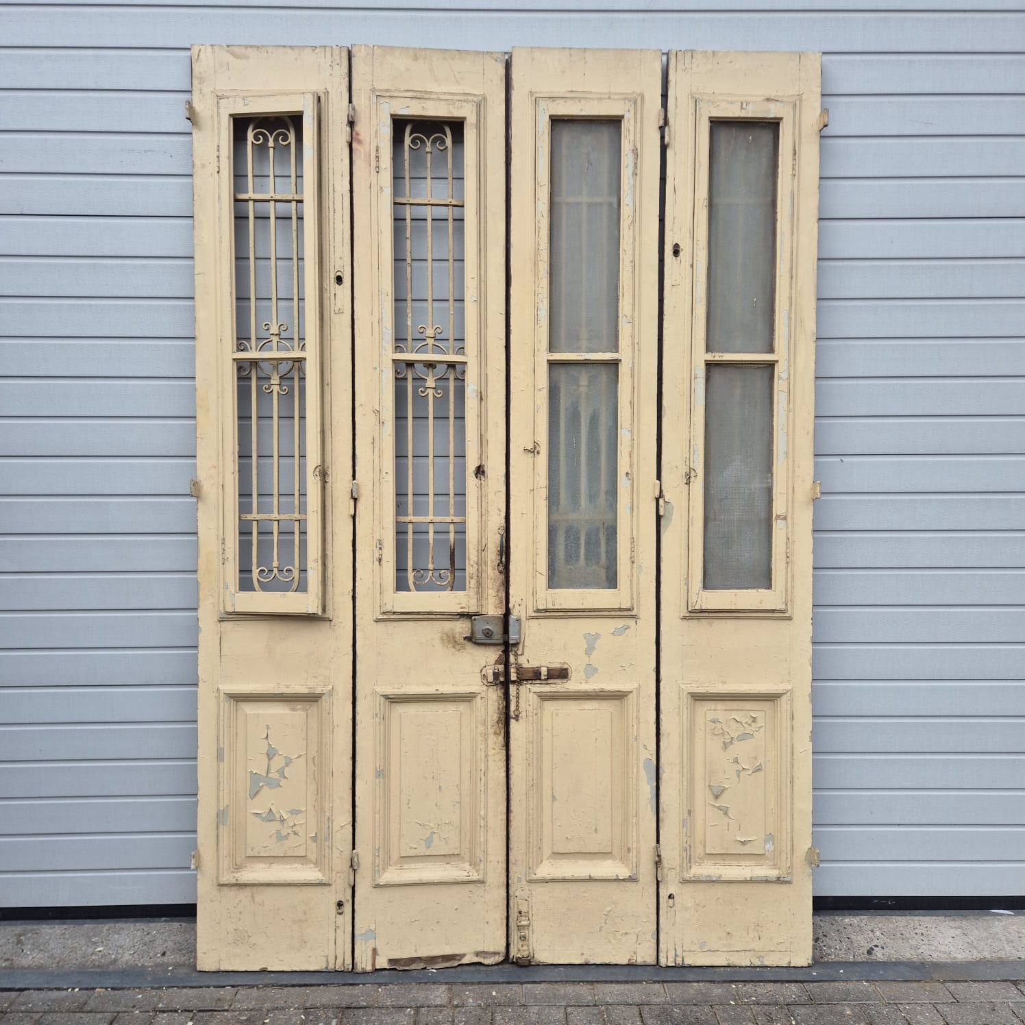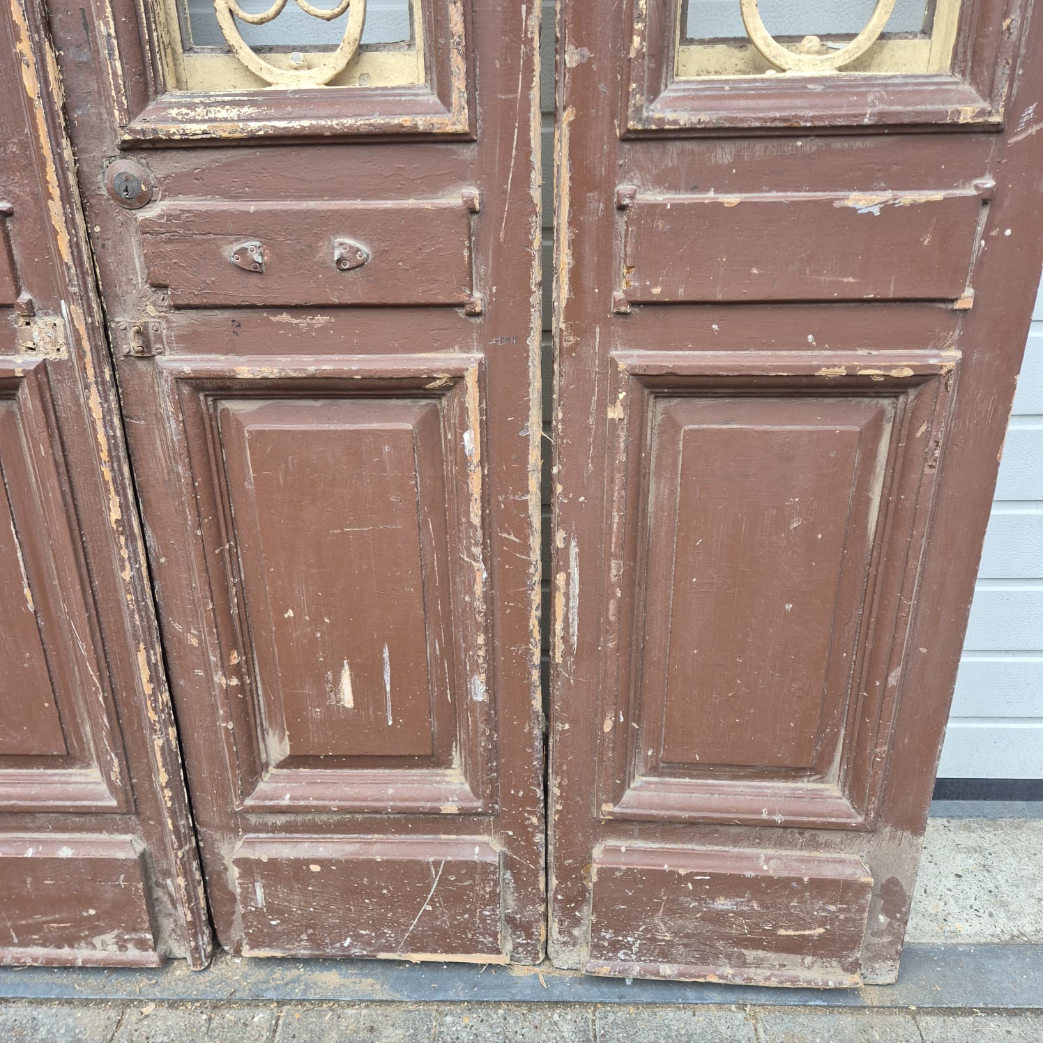 Give your home a unique character with this original example from the early 20th century. This double front door impresses with its authentic patina and the high-quality craftsmanship typical of the Gründerzeit era. Whether professionally restored or preserved in its charming shabby chic state, it is a real eye-catcher for historic buildings, country houses, or as a striking contrasting element in modern architecture.