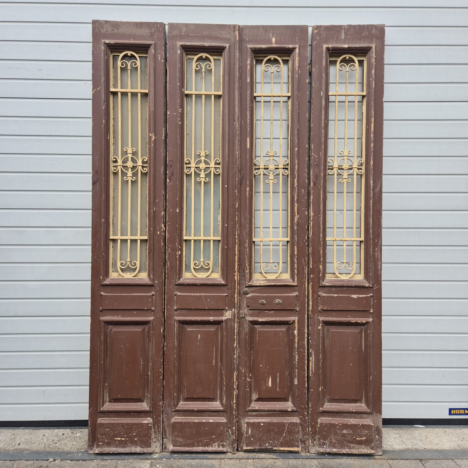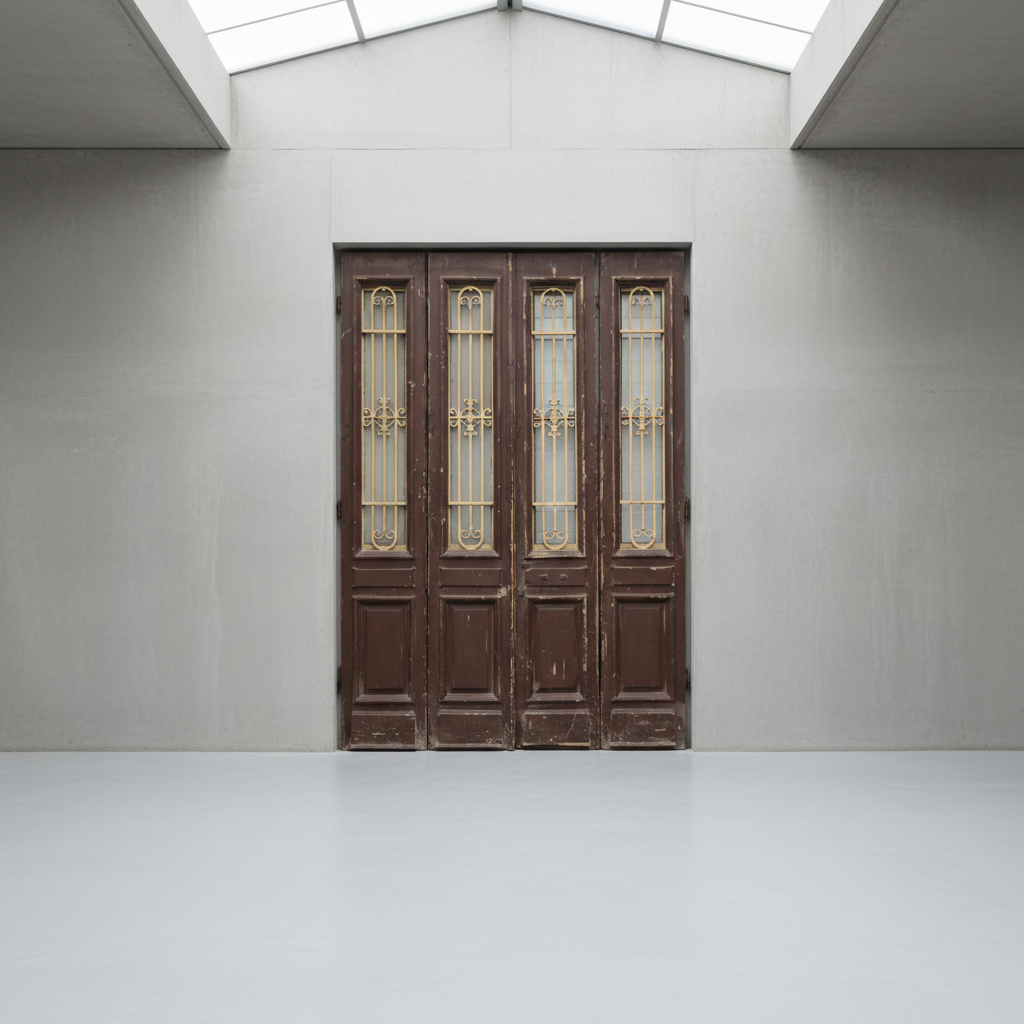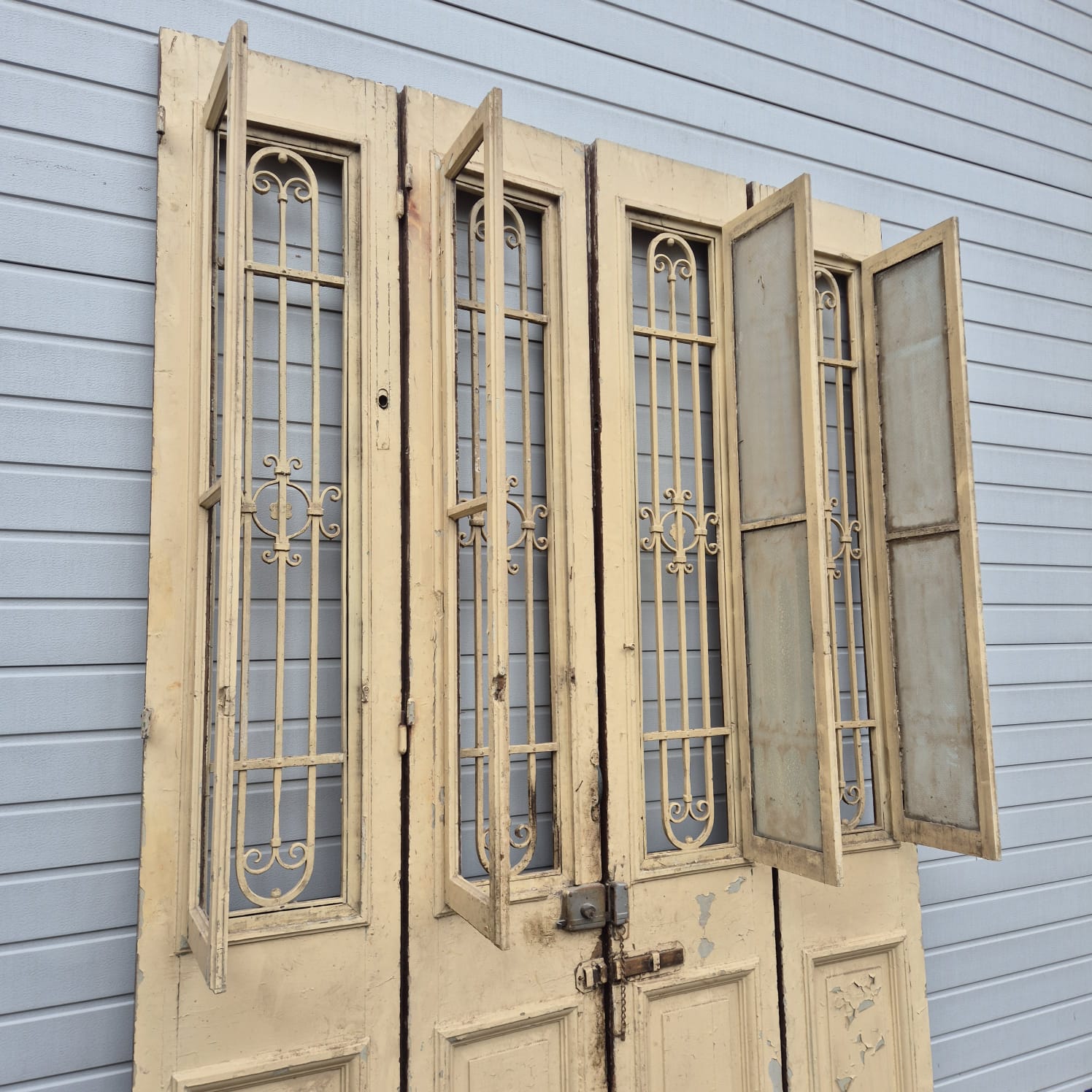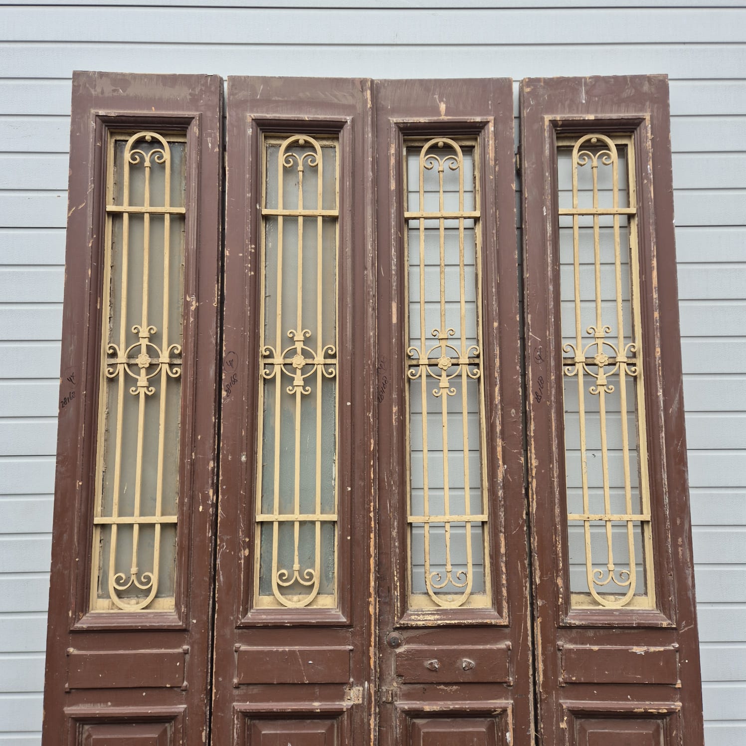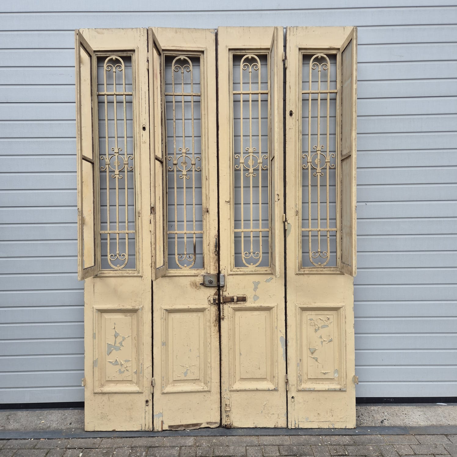 Give your home a unique character with this original example from the early 20th century. This double front door impresses with its authentic patina and the high-quality craftsmanship typical of the Gründerzeit era. Whether professionally restored or preserved in its charming shabby chic state, it is a real eye-catcher for historic buildings, country houses, or as a striking contrasting element in modern architecture.