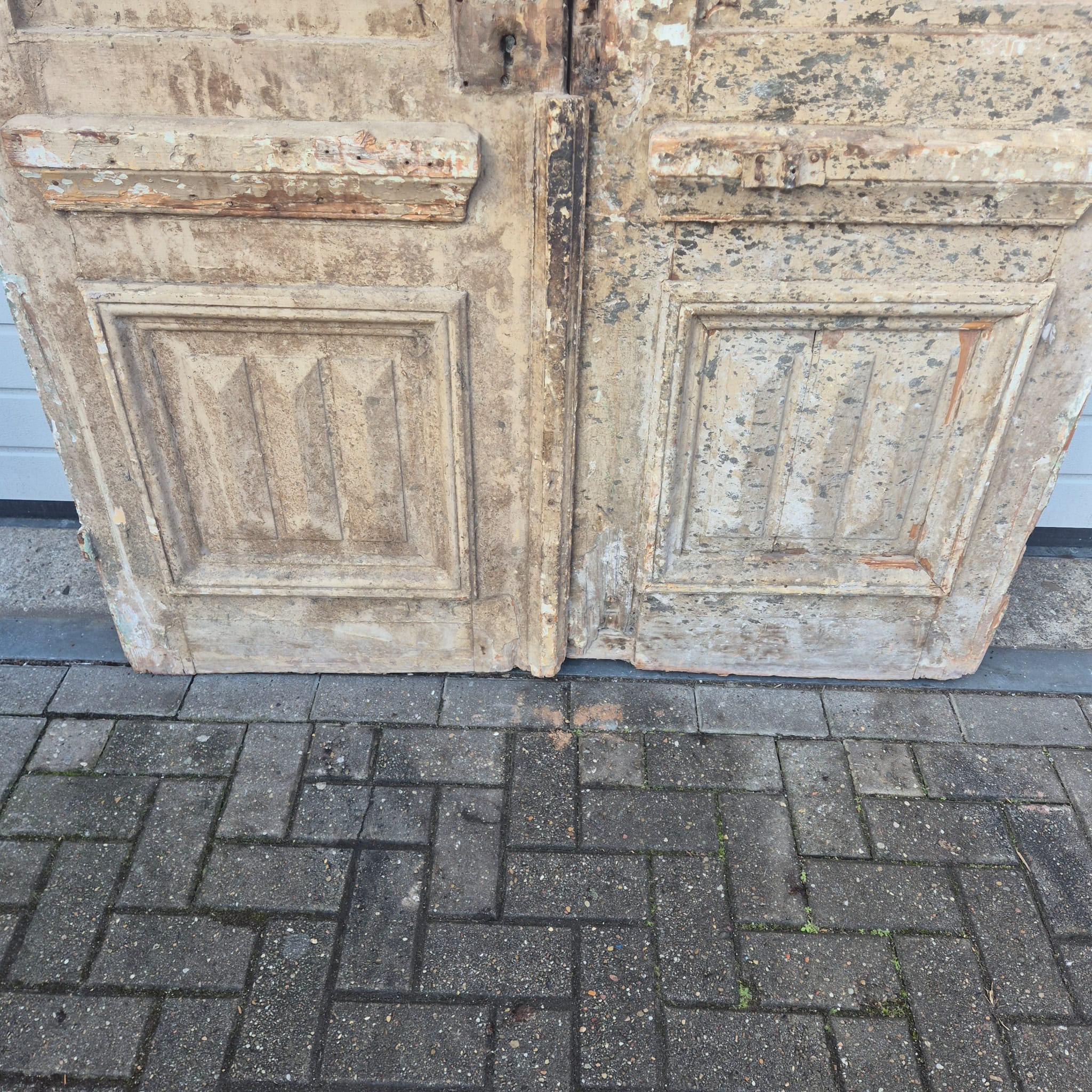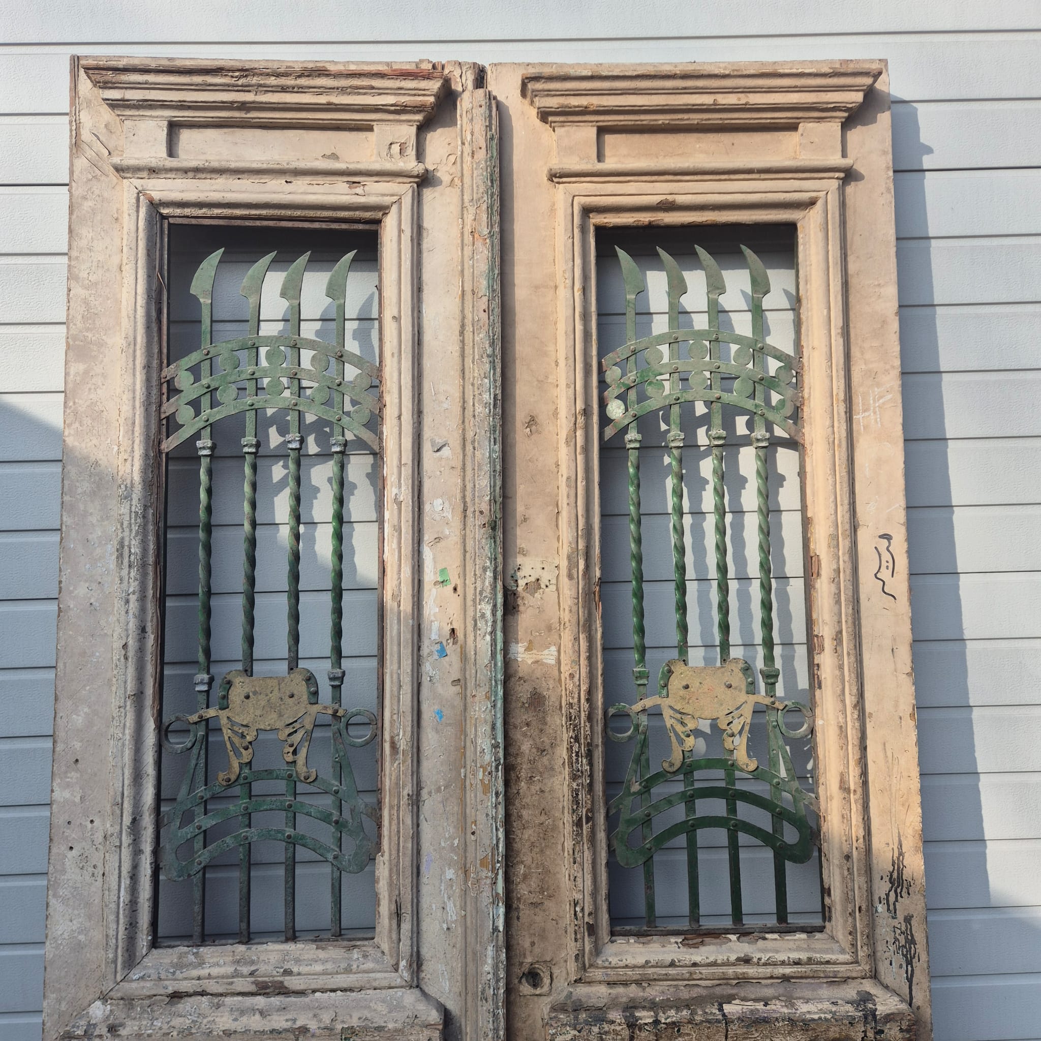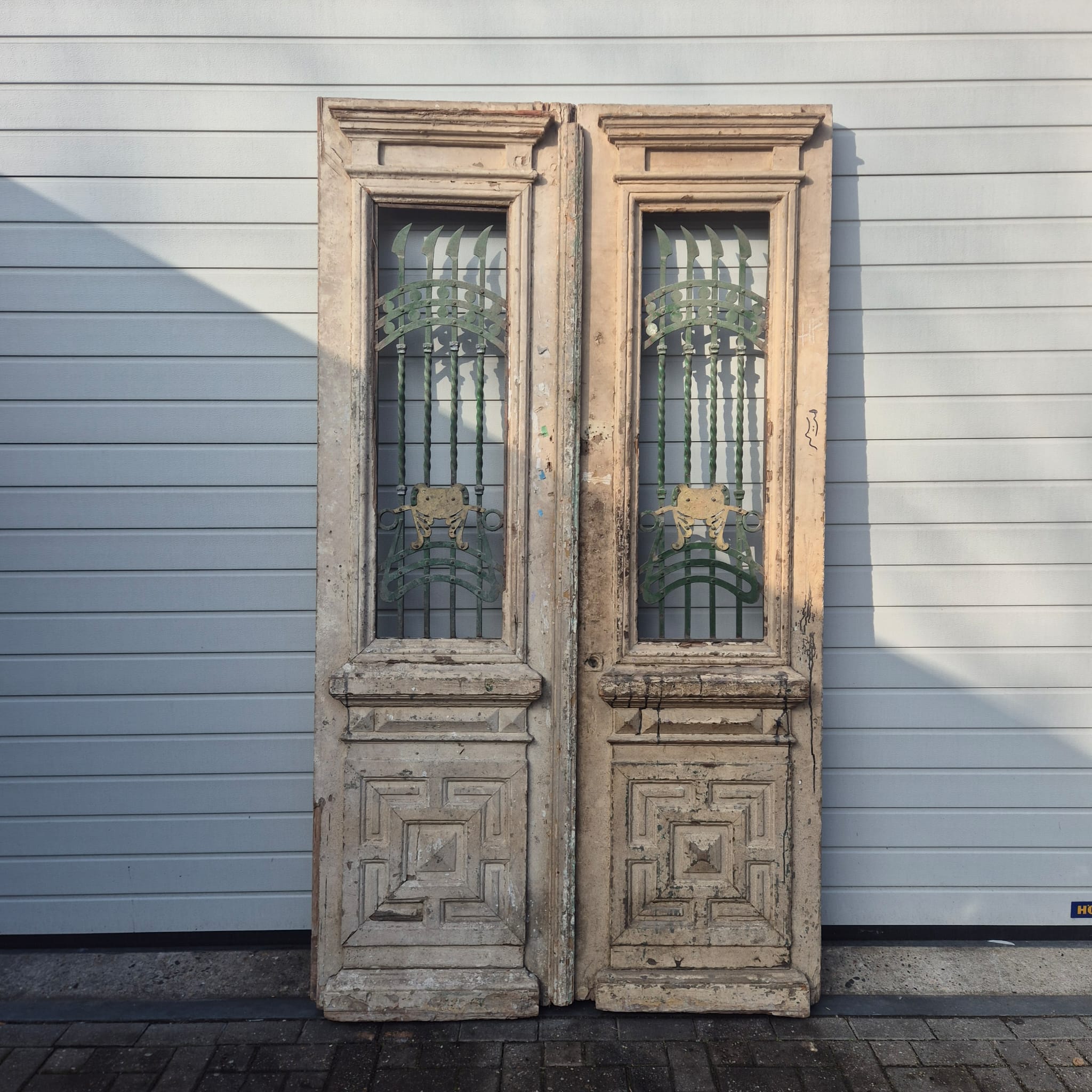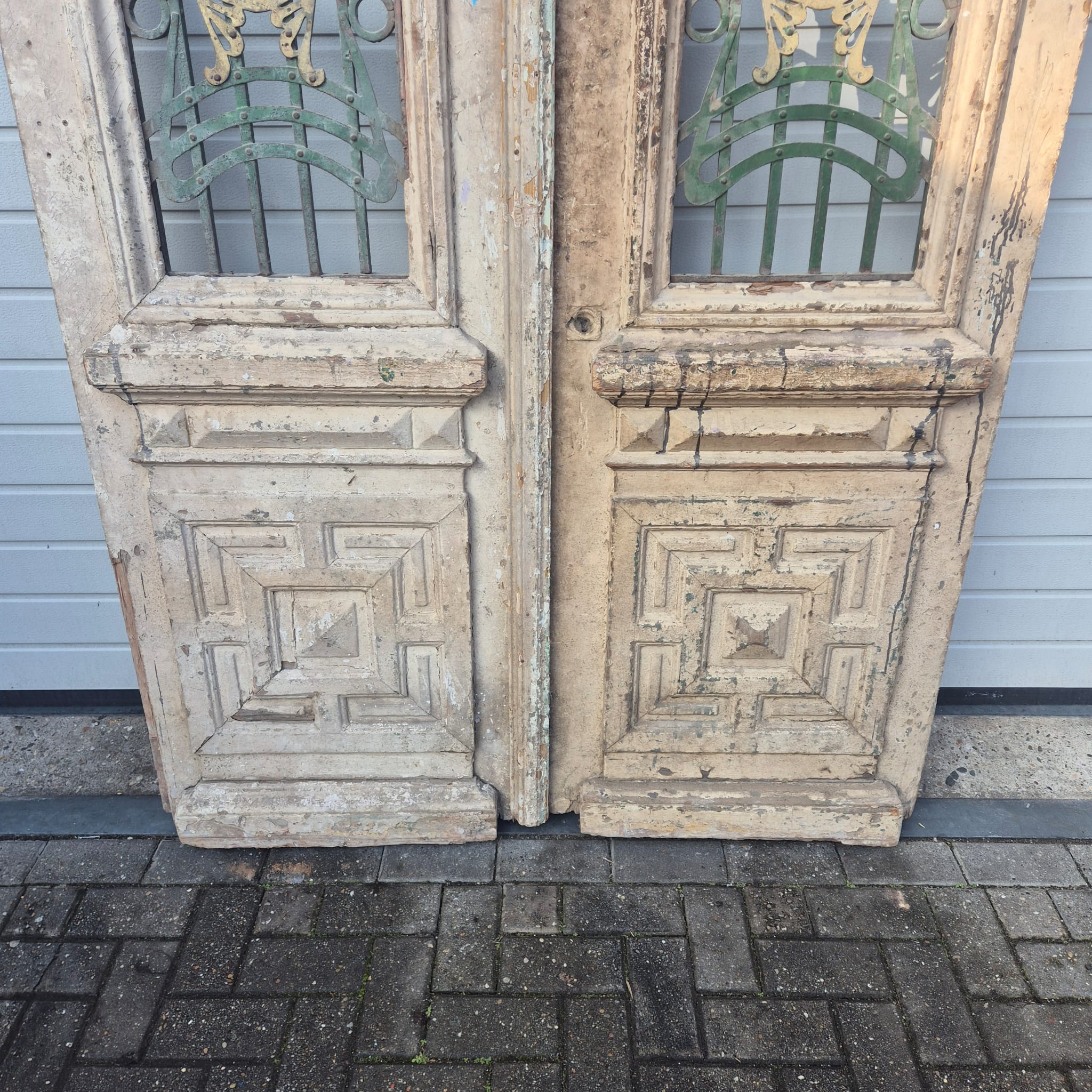 Give your home a unique character with this original example from the early 20th century. This double front door impresses with its authentic patina and high-quality Art Nouveau craftsmanship. Whether you have it professionally restored or leave it in its charming shabby chic state, it is a real eye-catcher for historic buildings, country houses, or as a striking contrasting element in modern architecture.
