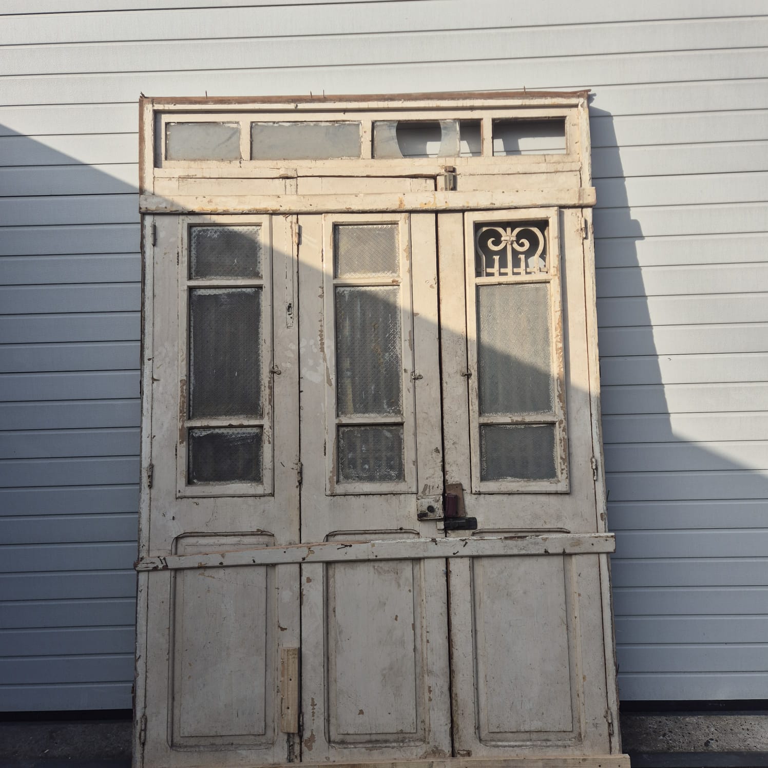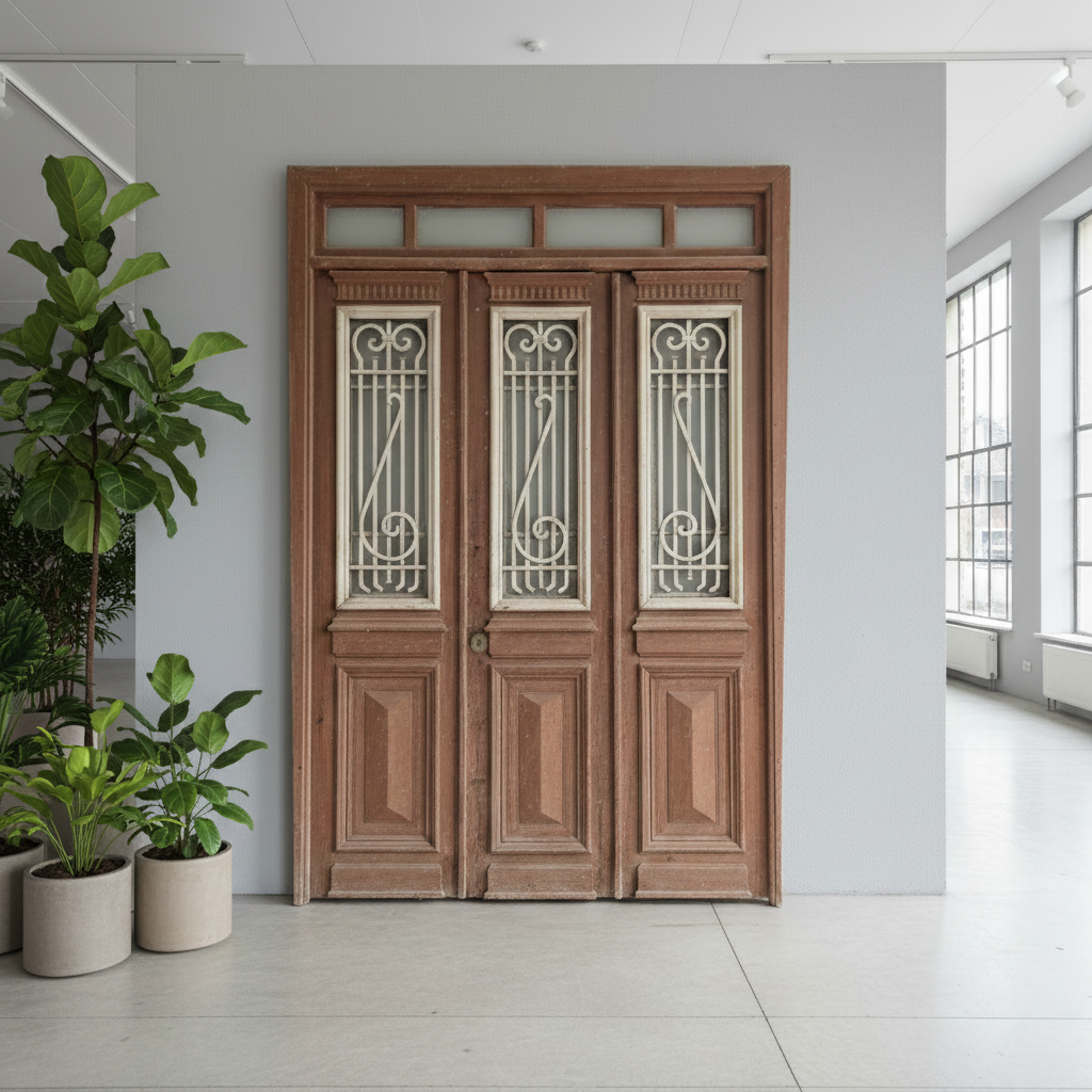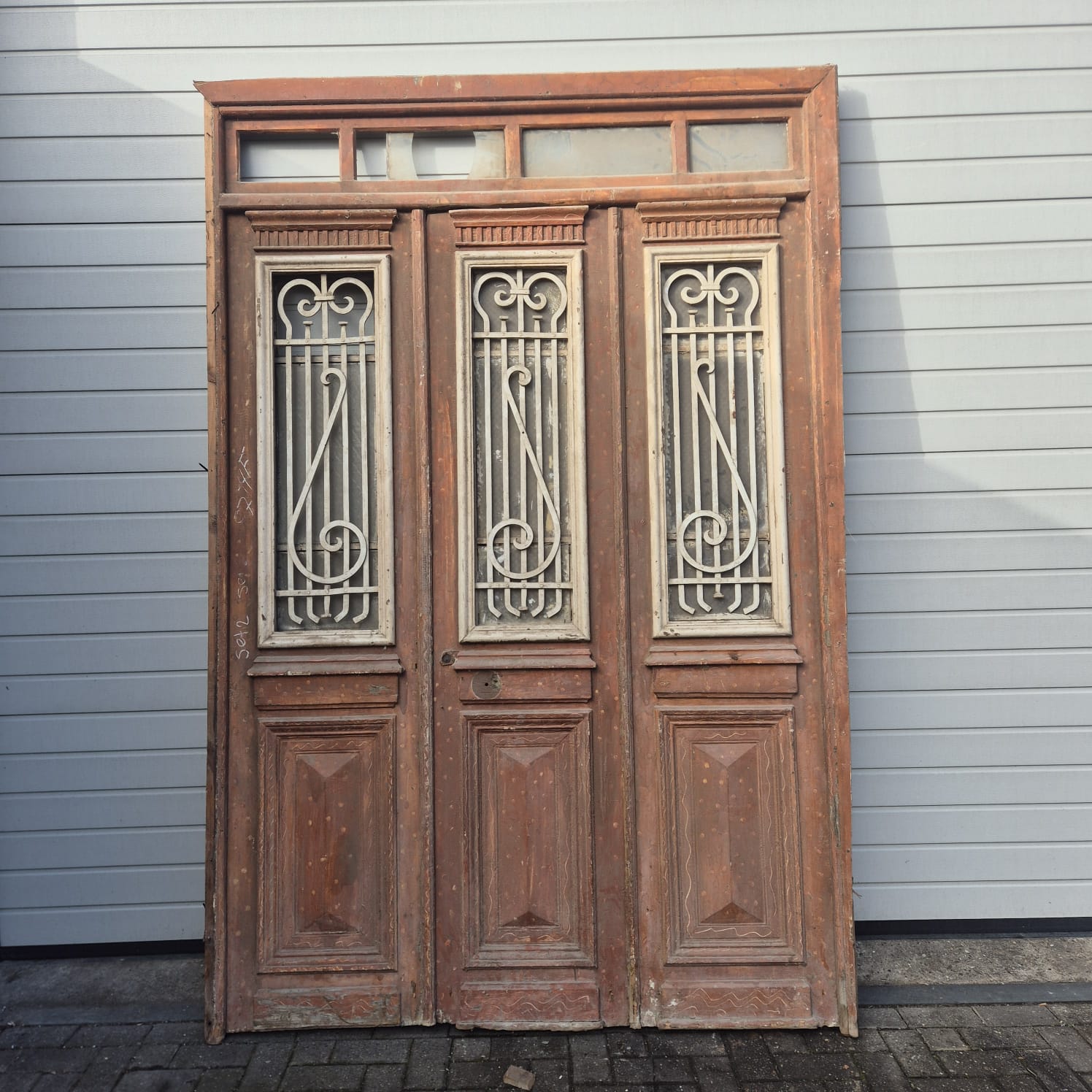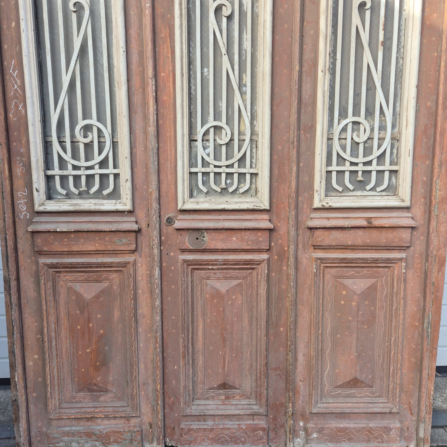Give your home a unique character with this original example from the early 20th century. This three-panel front door impresses with its authentic patina and high-quality Jugendstil craftsmanship. Whether you have it professionally restored or leave it in its charming shabby chic state, it's a real eye-catcher for historic buildings, country houses, or as a striking contrast in modern architecture. Two units available.