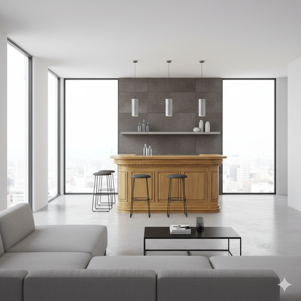 Shelf of an English bar made of solid teak.