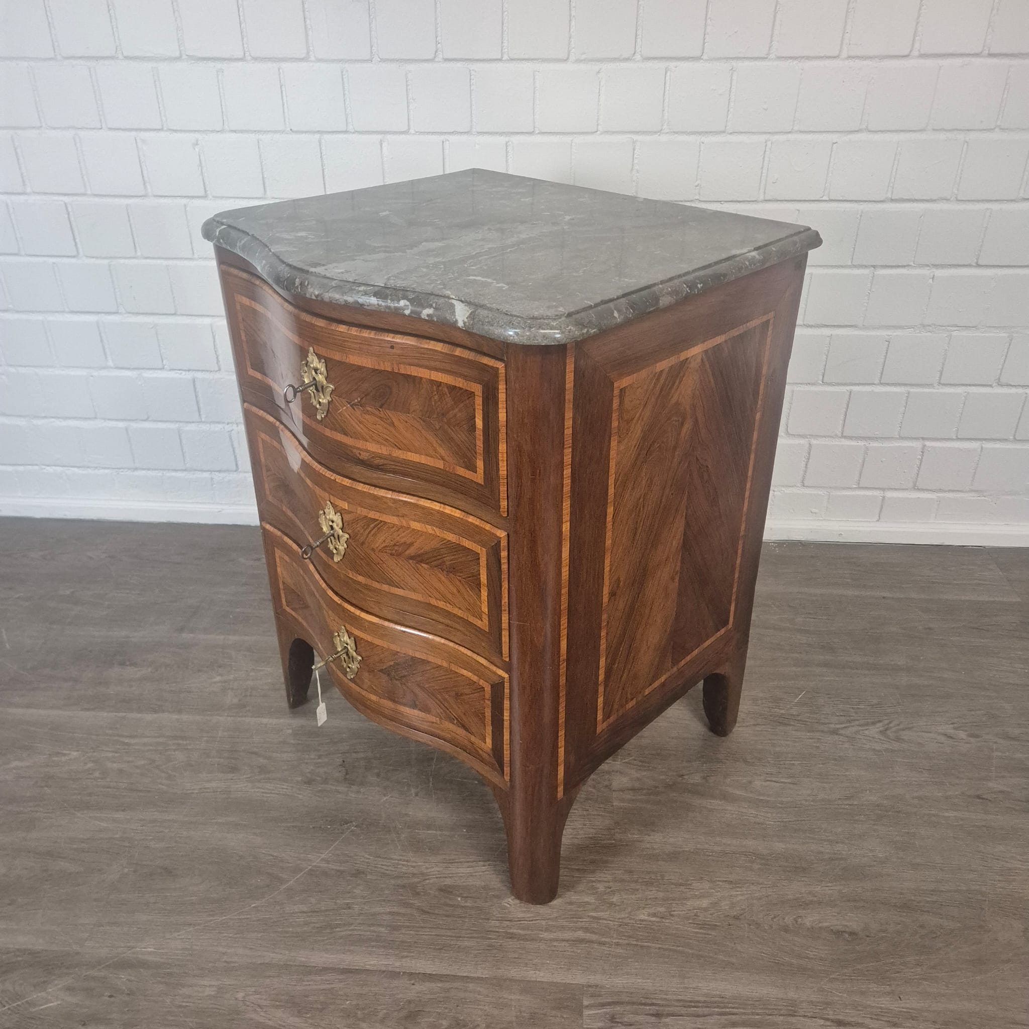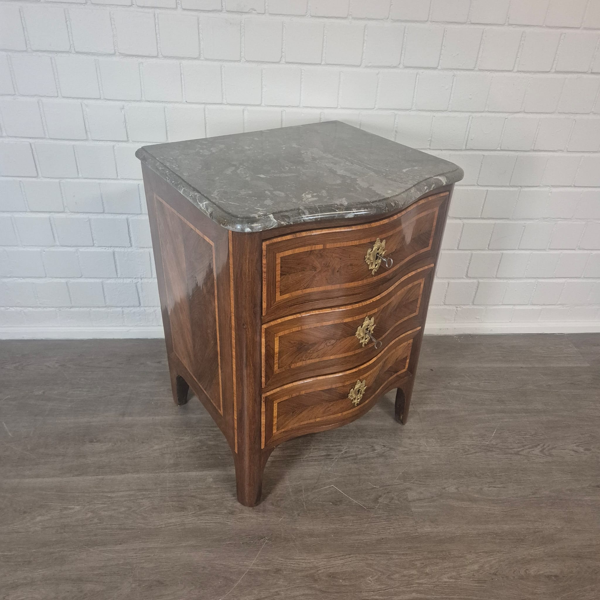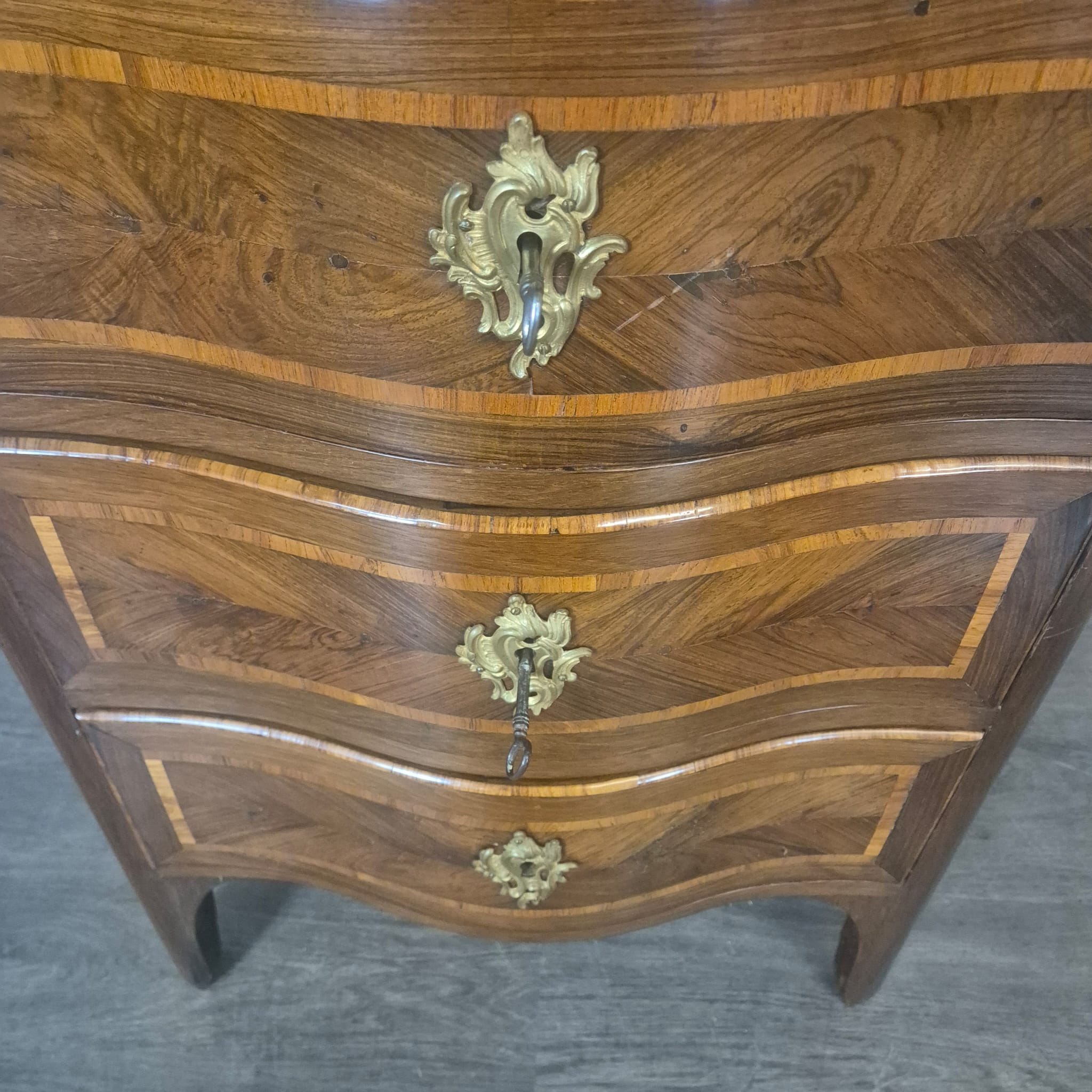 Restored Baroque chest of drawers in walnut veneer (lacquered), dating from approximately 1780. The chest is in good condition and shows only minor signs of wear.