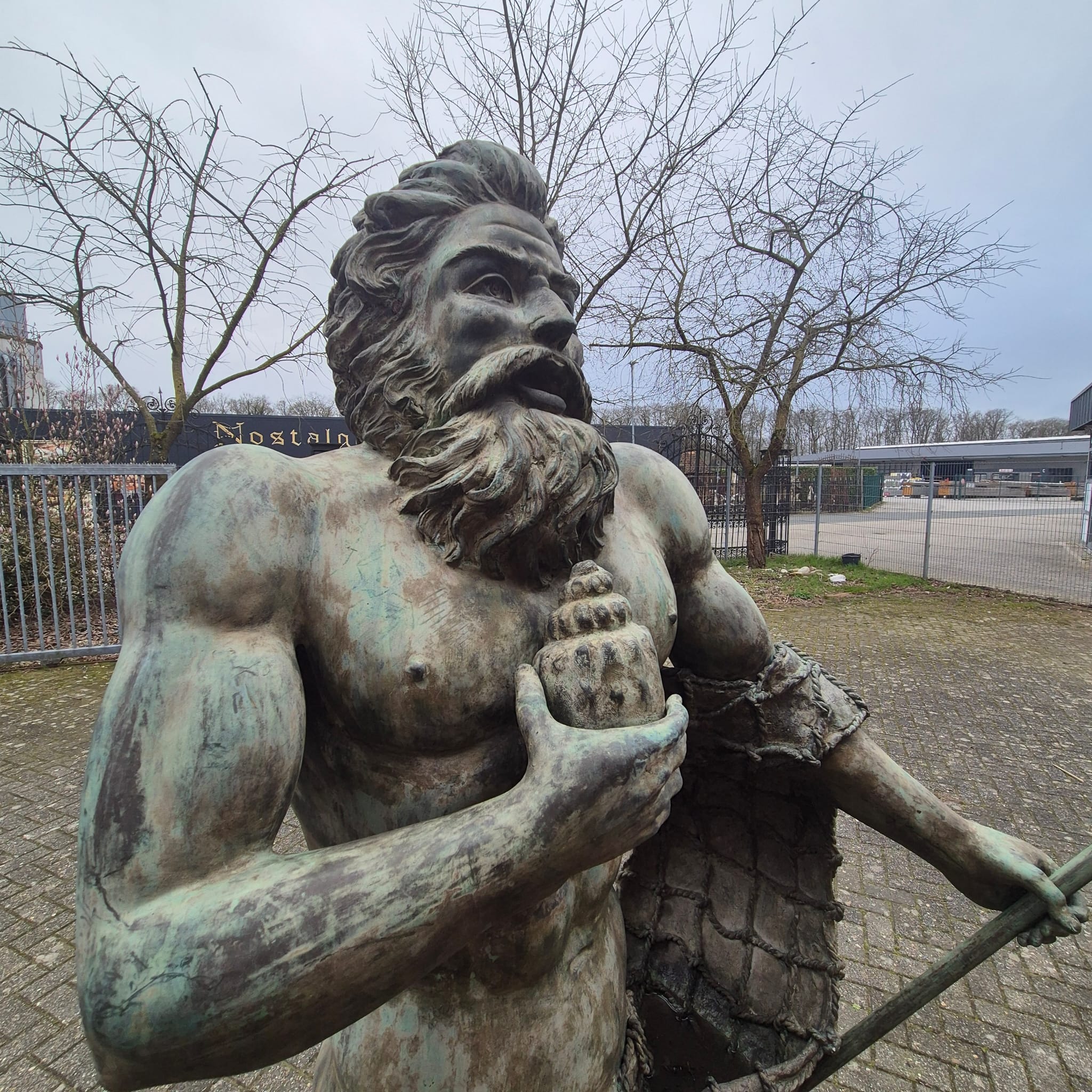He holds a conch shell in his right hand and his famous trident in his left hand. A fishing net is wrapped around his waist and legs, emphasizing his connection to the sea.