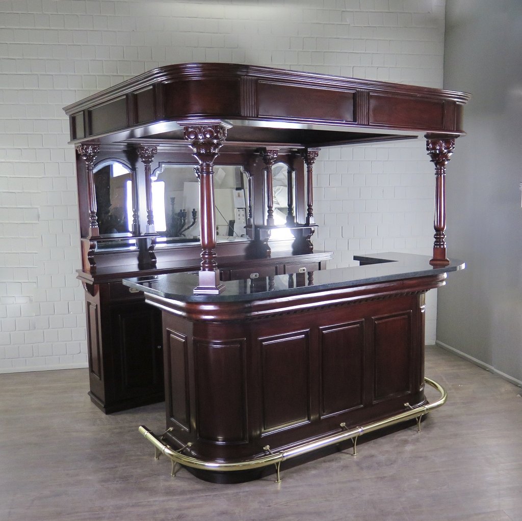 Home bar made of solid wood with mirrors and columns.