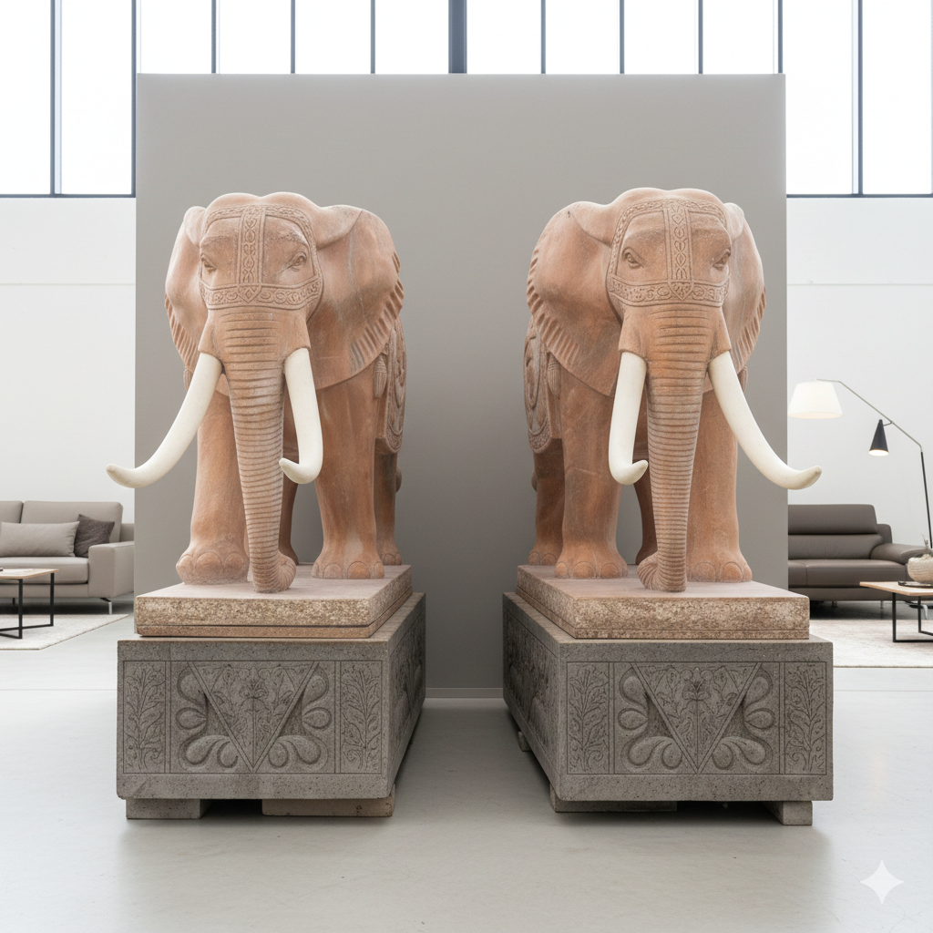 Stylishly designed approx. 40 year old elephants made of marble including matching stone bases. Weight per elephant including base approx. 5000 kg. Set price.