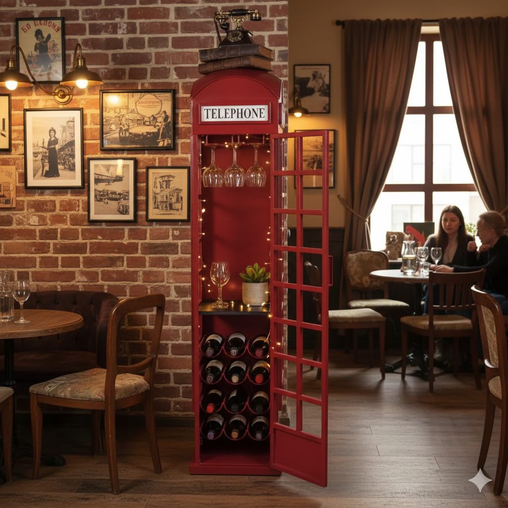Uniquely designed bar in the shape of an English phone box made metal.