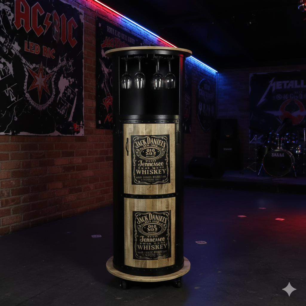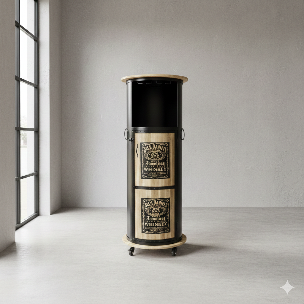 Uniquely designed minibar on wheels in the shape of a barrel made of metal and mango wood.