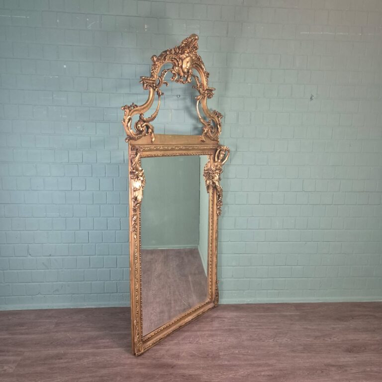 Made of solid wood, this mirror impresses with its heavy and robust construction. The intricate, three-dimensional ornamentation is expertly carved and finished with a rich gold-lacquered finish, giving the frame a luxurious and radiant sheen.