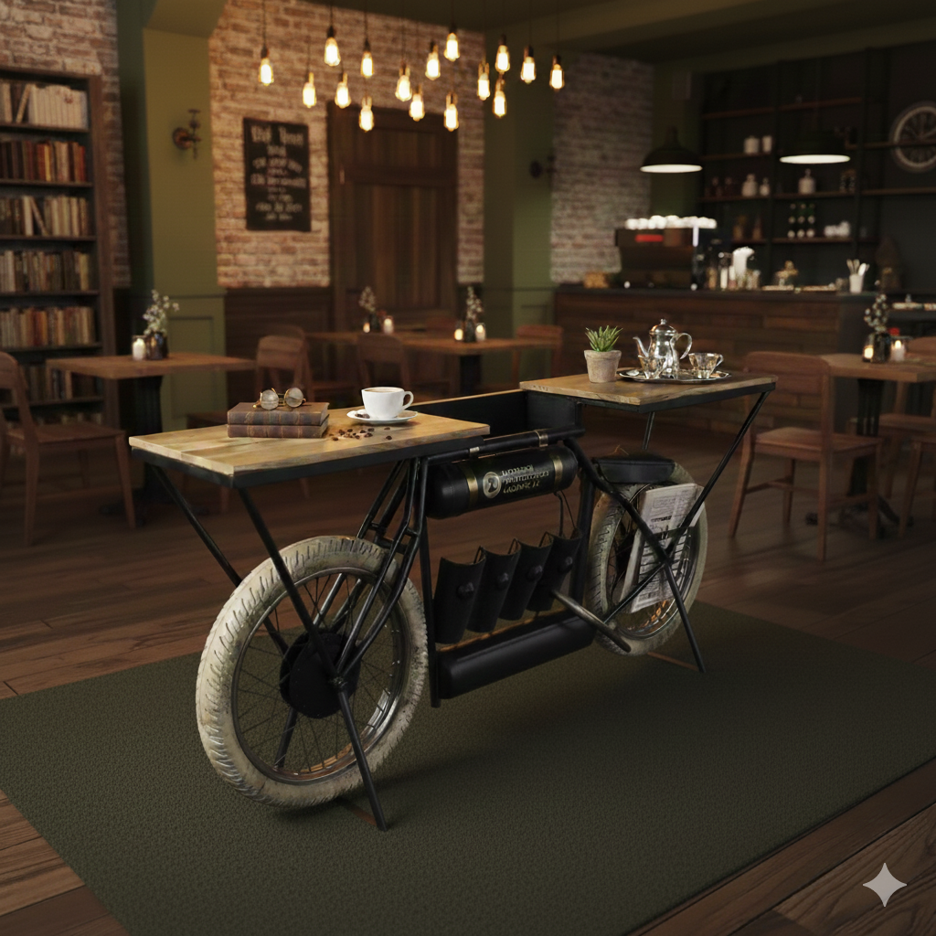 This uniquely designed minibar, made from original motorcycle parts, gets its special effect from the materials used, which give this piece a special character and make it unique. The style and color of the metal greatly contribute to the visual value of this piece of furniture, which offers both decorative possibilities and ample storage space.