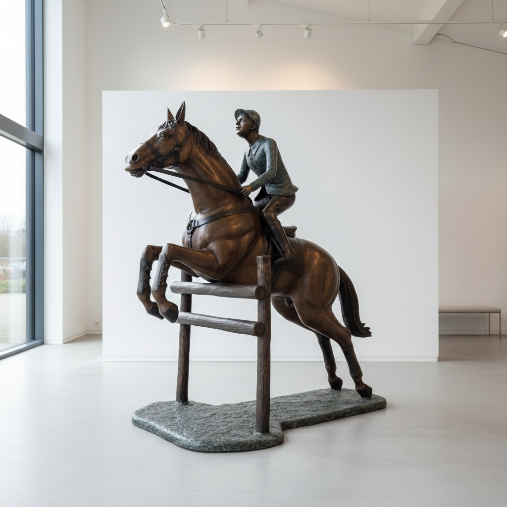 Bring the elegance and dynamism of equestrian sports to your outdoor space or spacious interior. This monumental bronze sculpture masterfully captures the thrilling moment a show jumping horse soars over the jump.