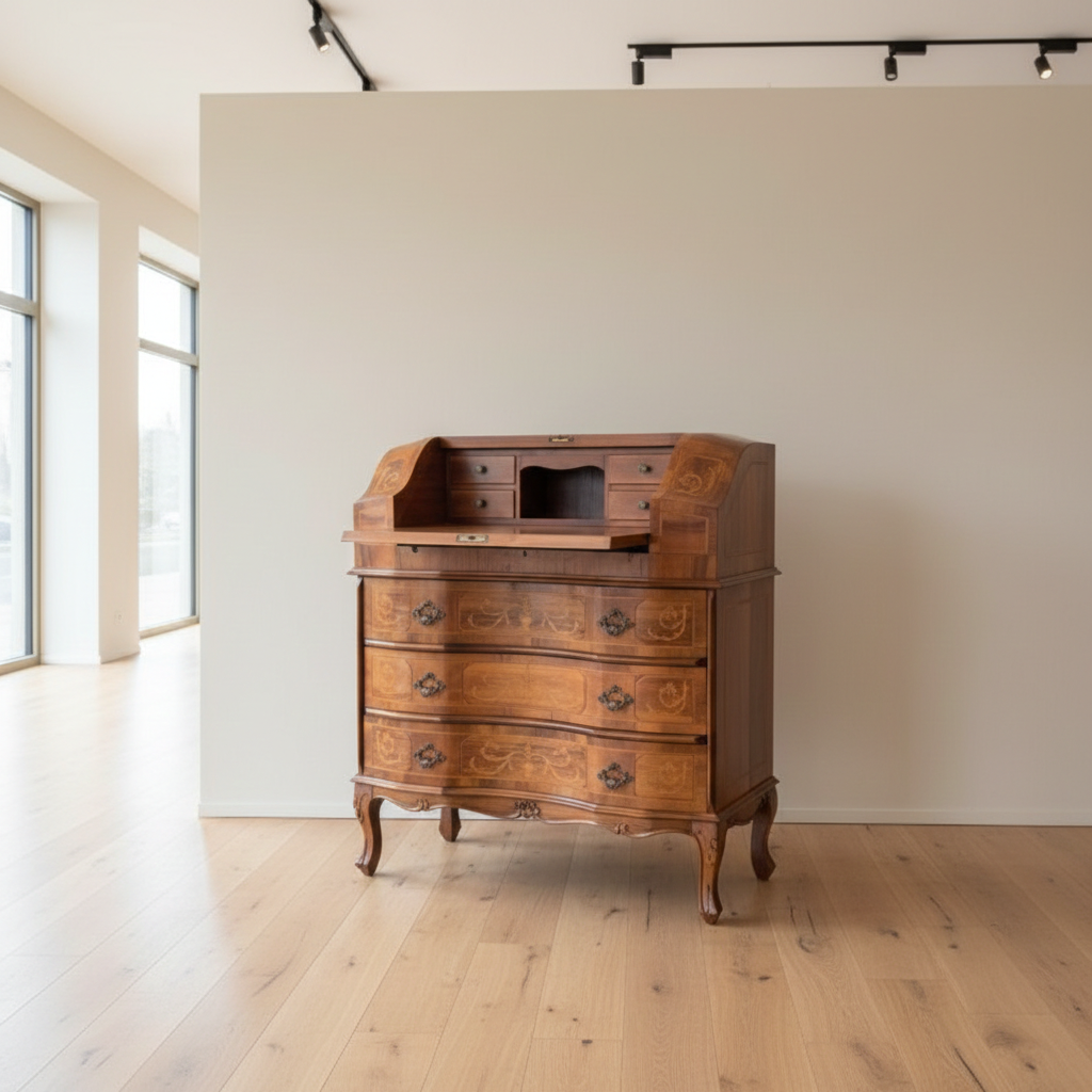 Stylish neo-baroque secretary desk from circa 1950, veneered in walnut with inlay and waxed. This small secretary desk is in very good condition and shows minimal signs of use.