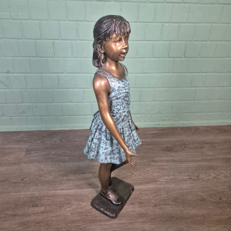 Add a touch of grace and childlike innocence to your garden, patio, or interior with this enchanting bronze statue of a girl. This work of art beautifully captures the playful and dreamy demeanor of a young girl and is guaranteed to be an eye-catcher.