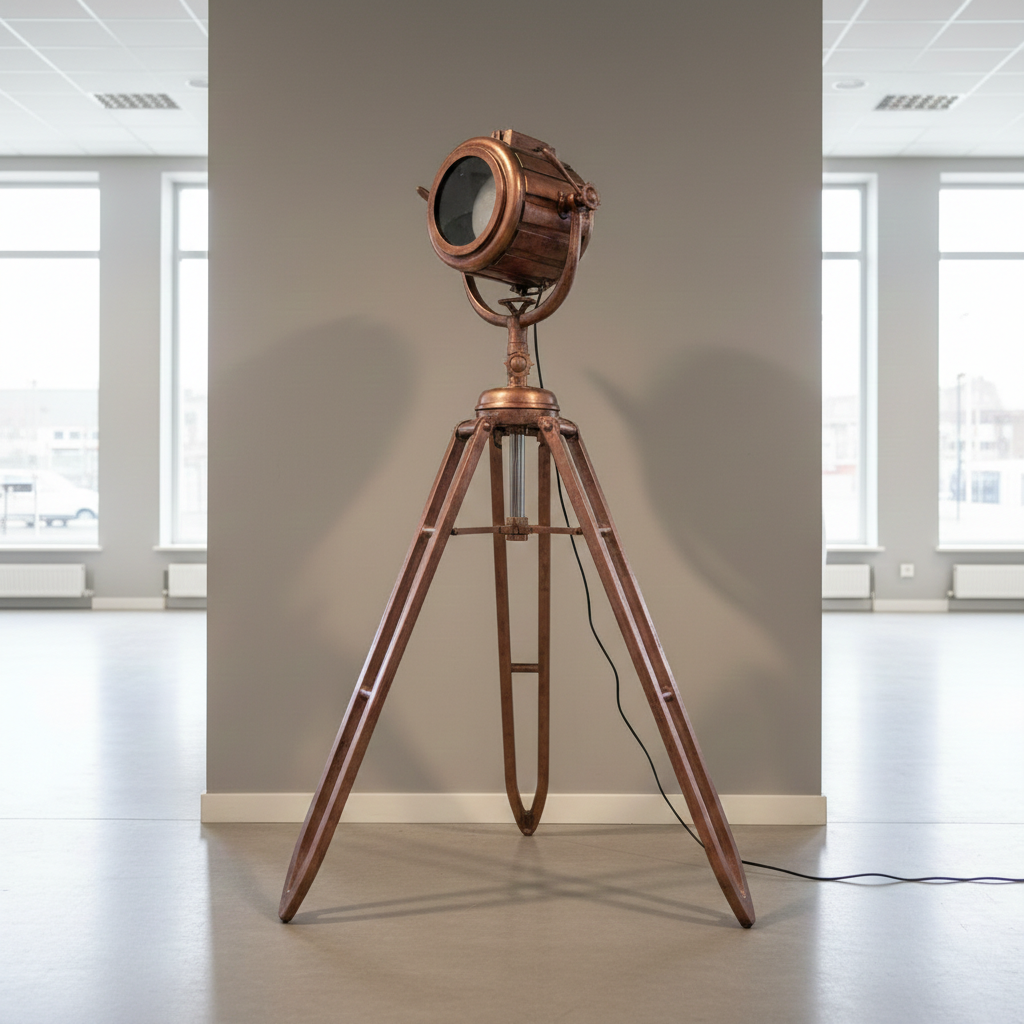 Tripod lamp made of metal in copper color.
