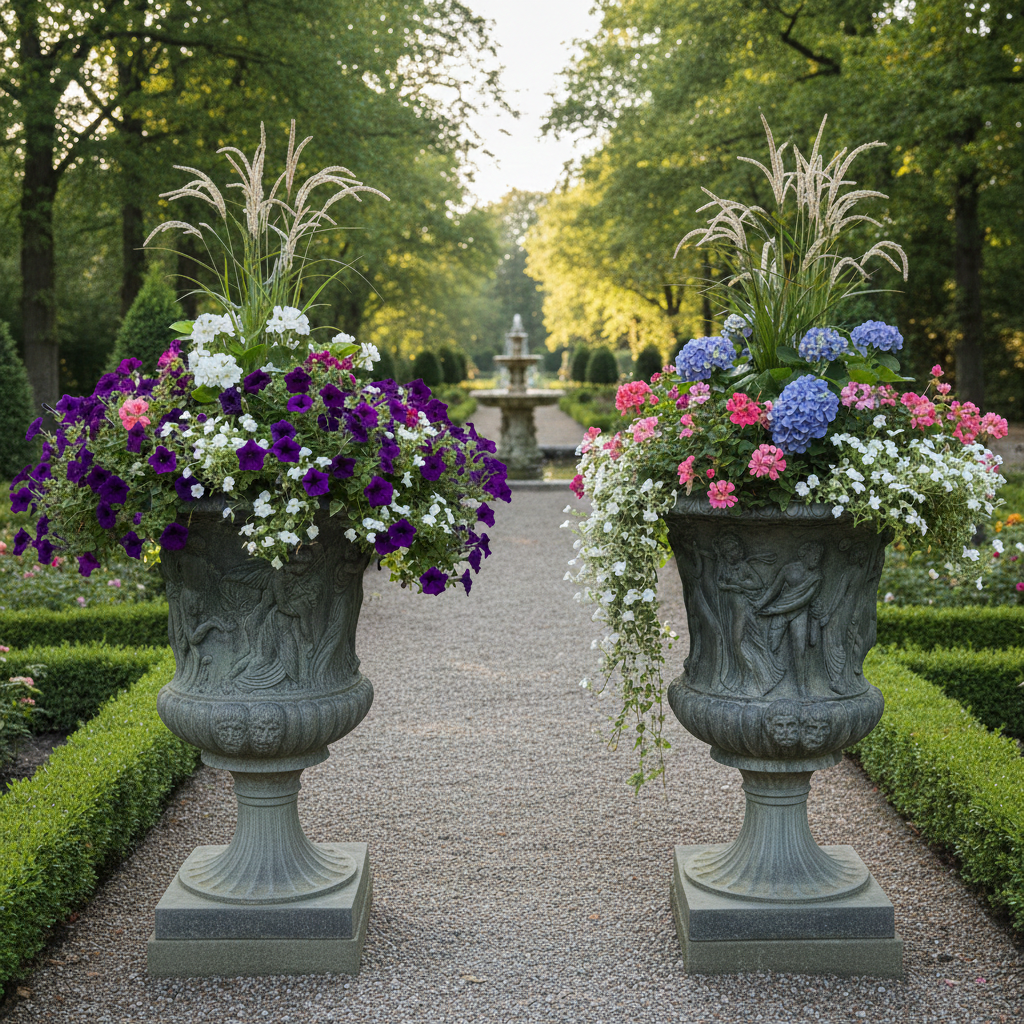 Design: Classic design, artfully decorated with detailed reliefs reminiscent of historical models (similar to the Medici vase). The base is decorated with characteristic mascarons (facial decorations).