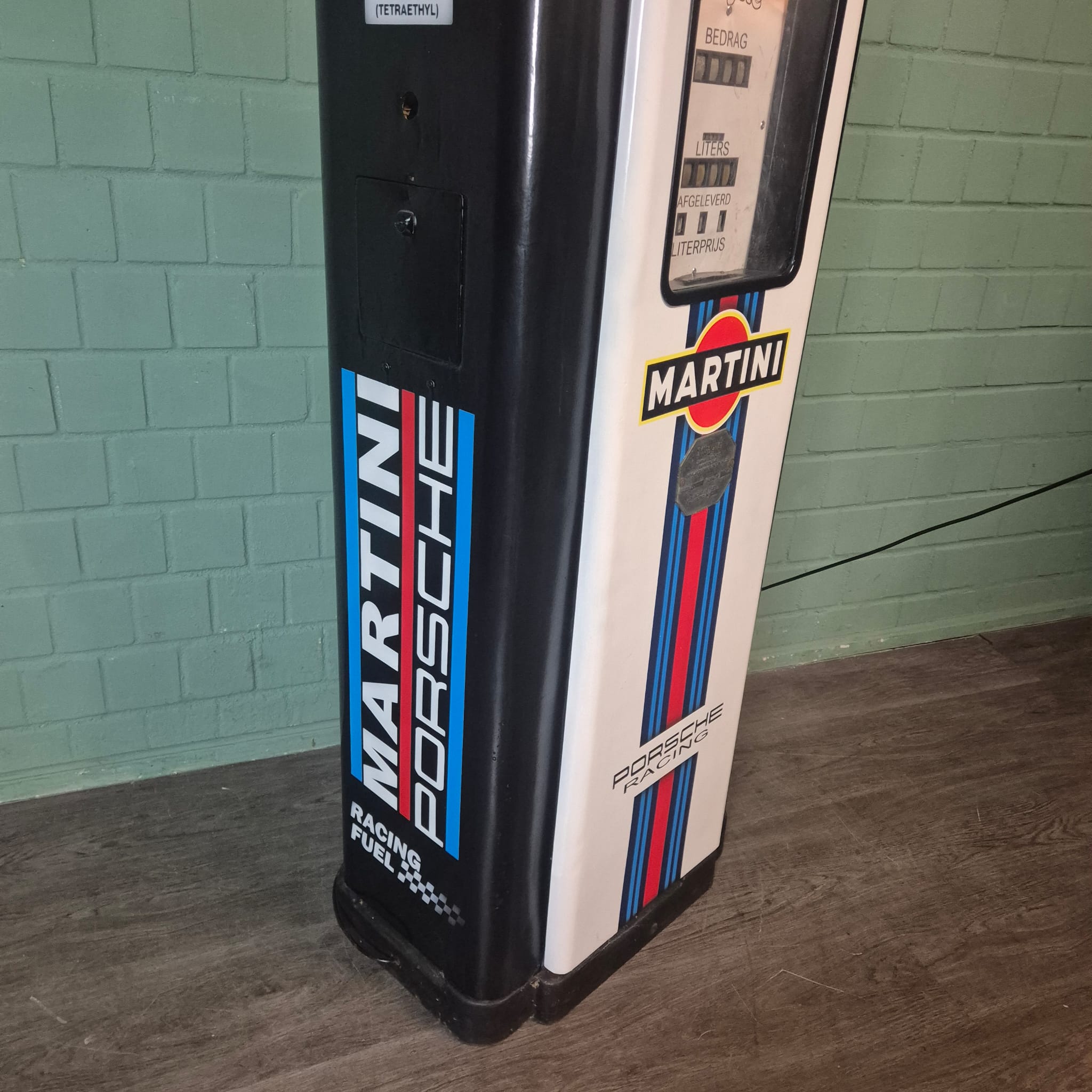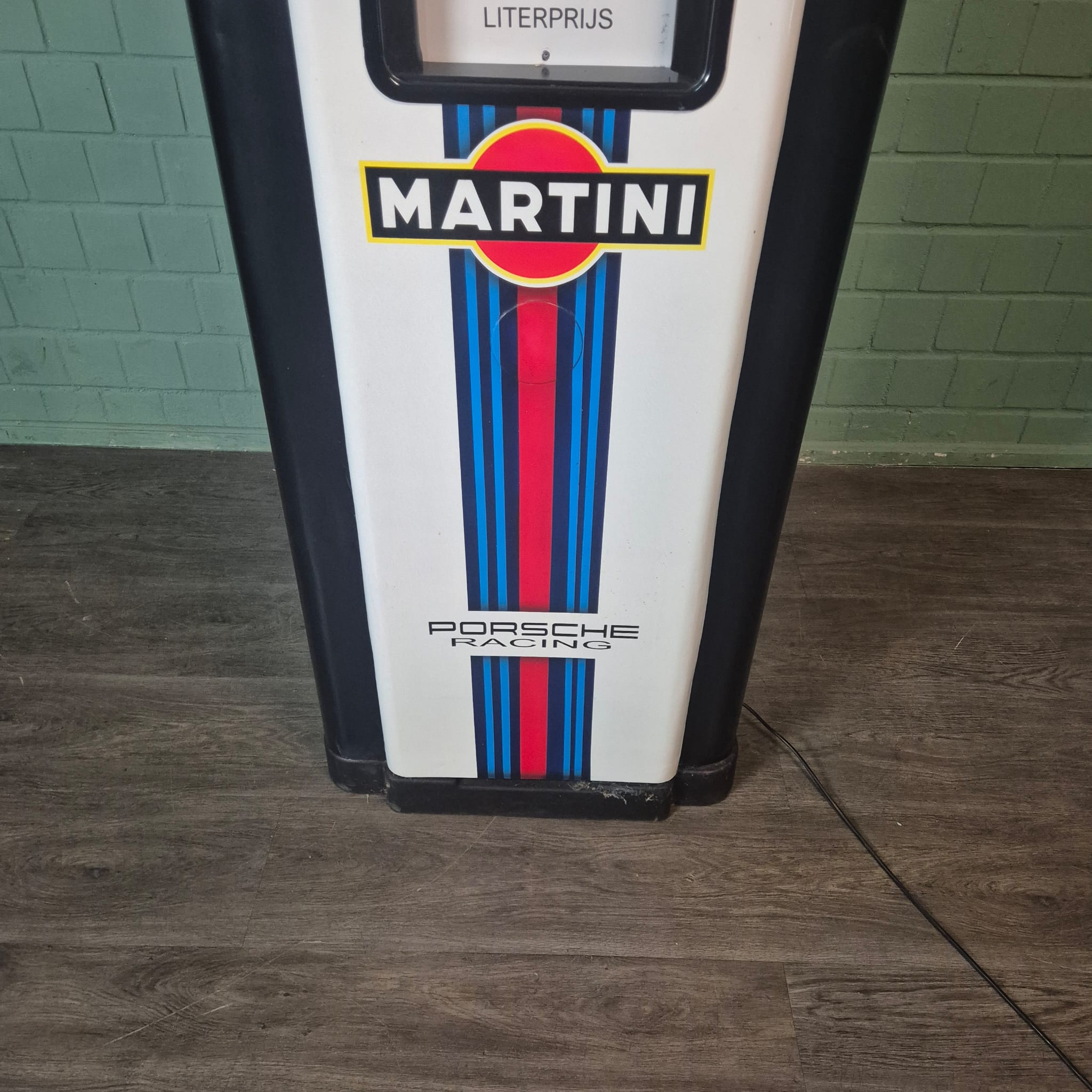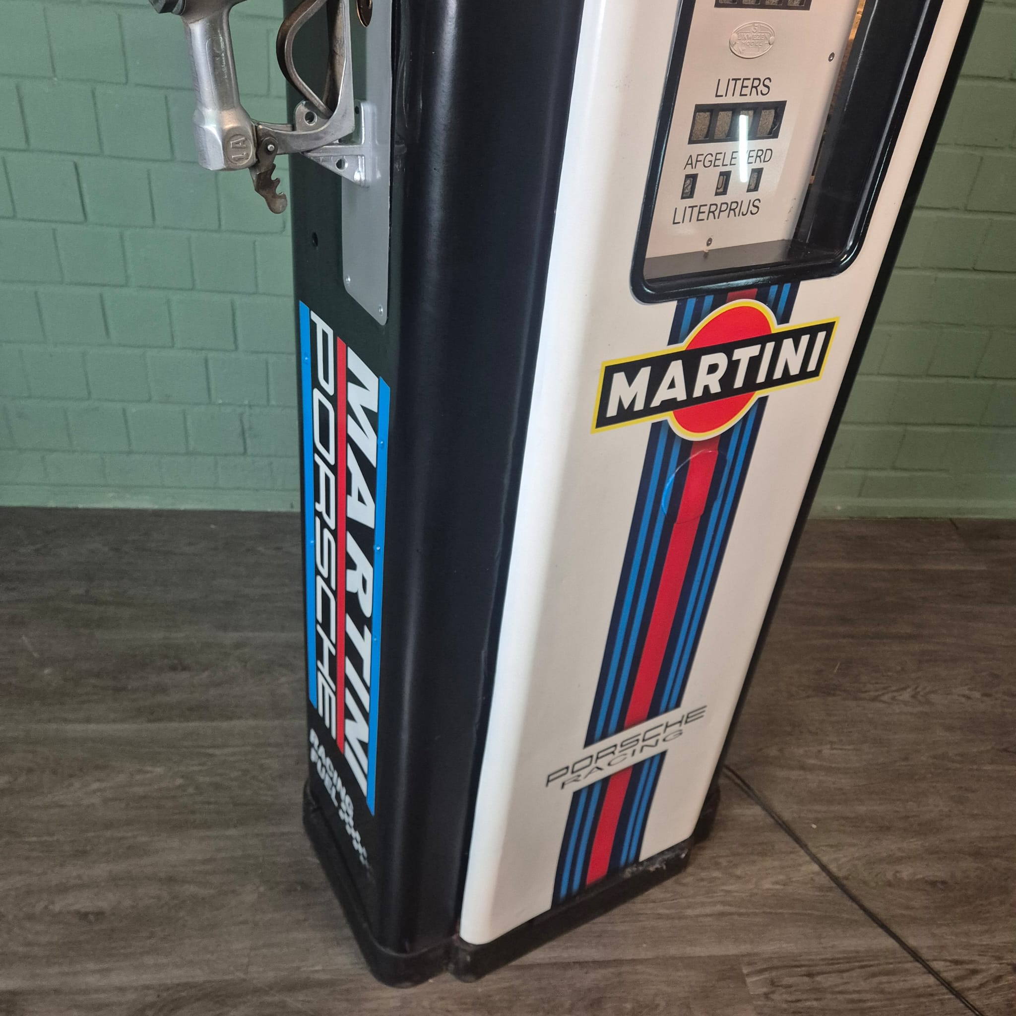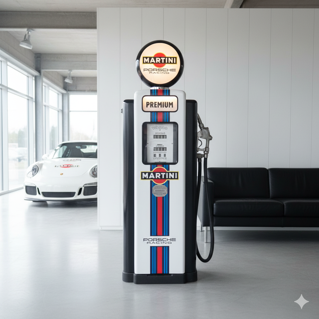 4.999,00€ Ex Tax:Restored Wayne fuel pump from the 1950s in Martini Porsche Racing livery. The paint pays tribute to the famous Martini Racing design with its characteristic blue, light blue, and red stripes, closely associated with Porsche's motorsport successes (particularly in the 1970s with the Porsche 917). The pump was originally used in the Netherlands and/or for the Dutch market.