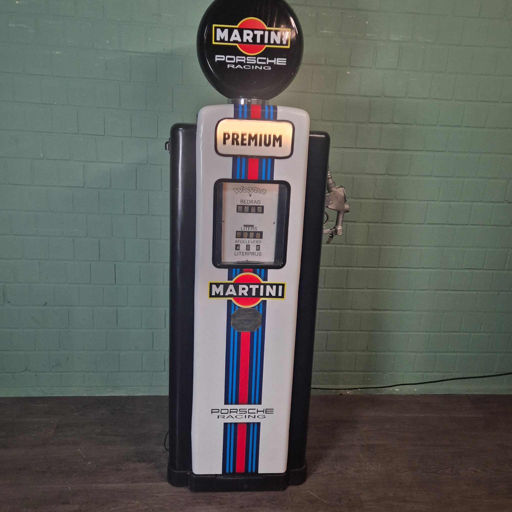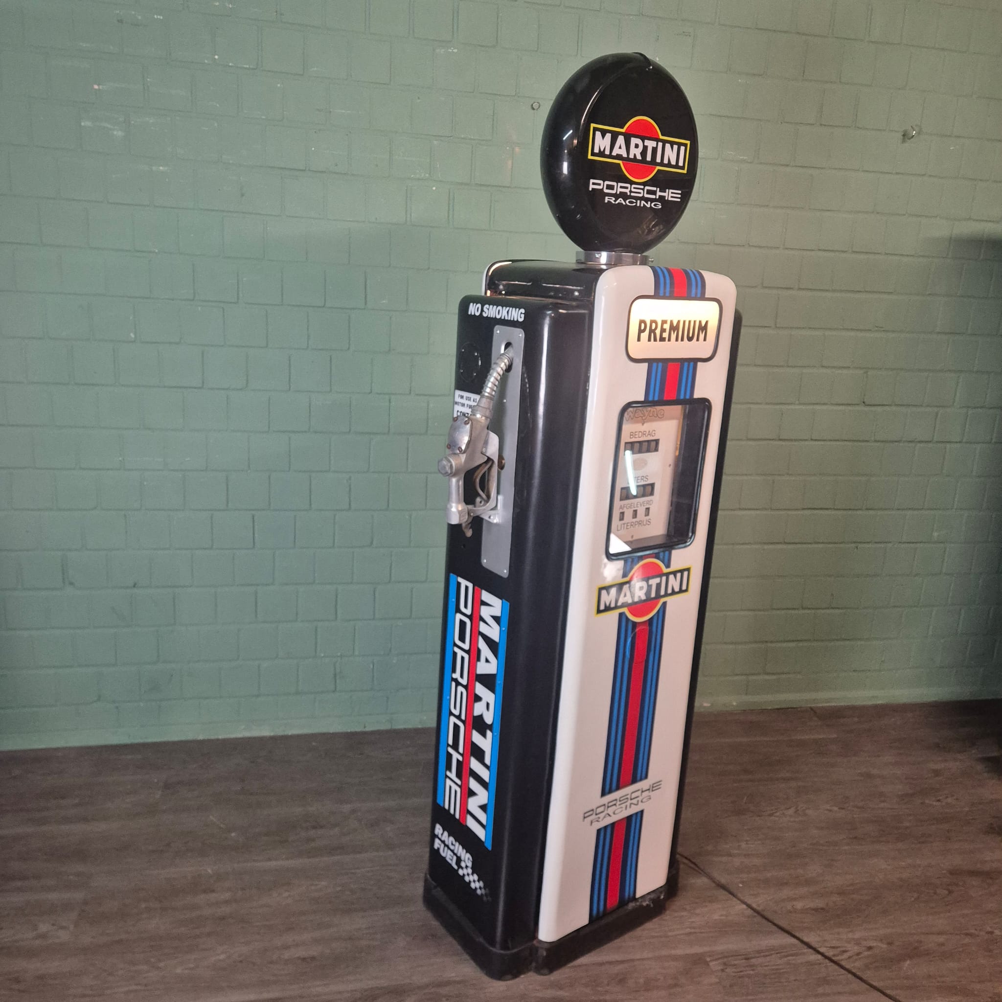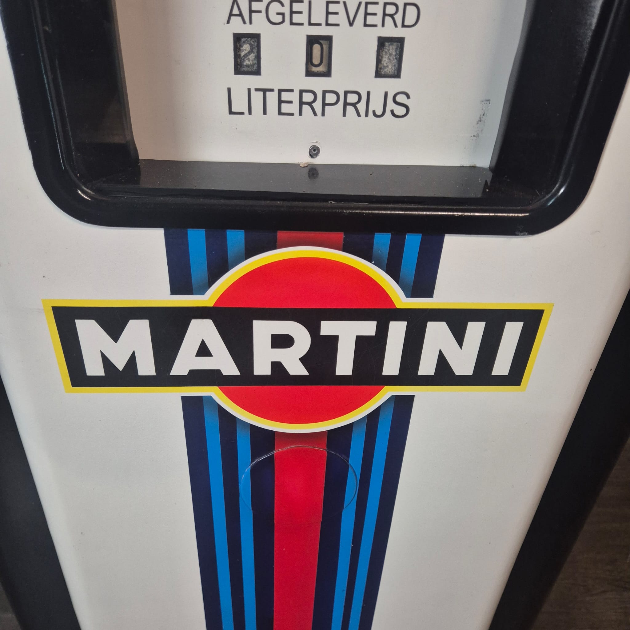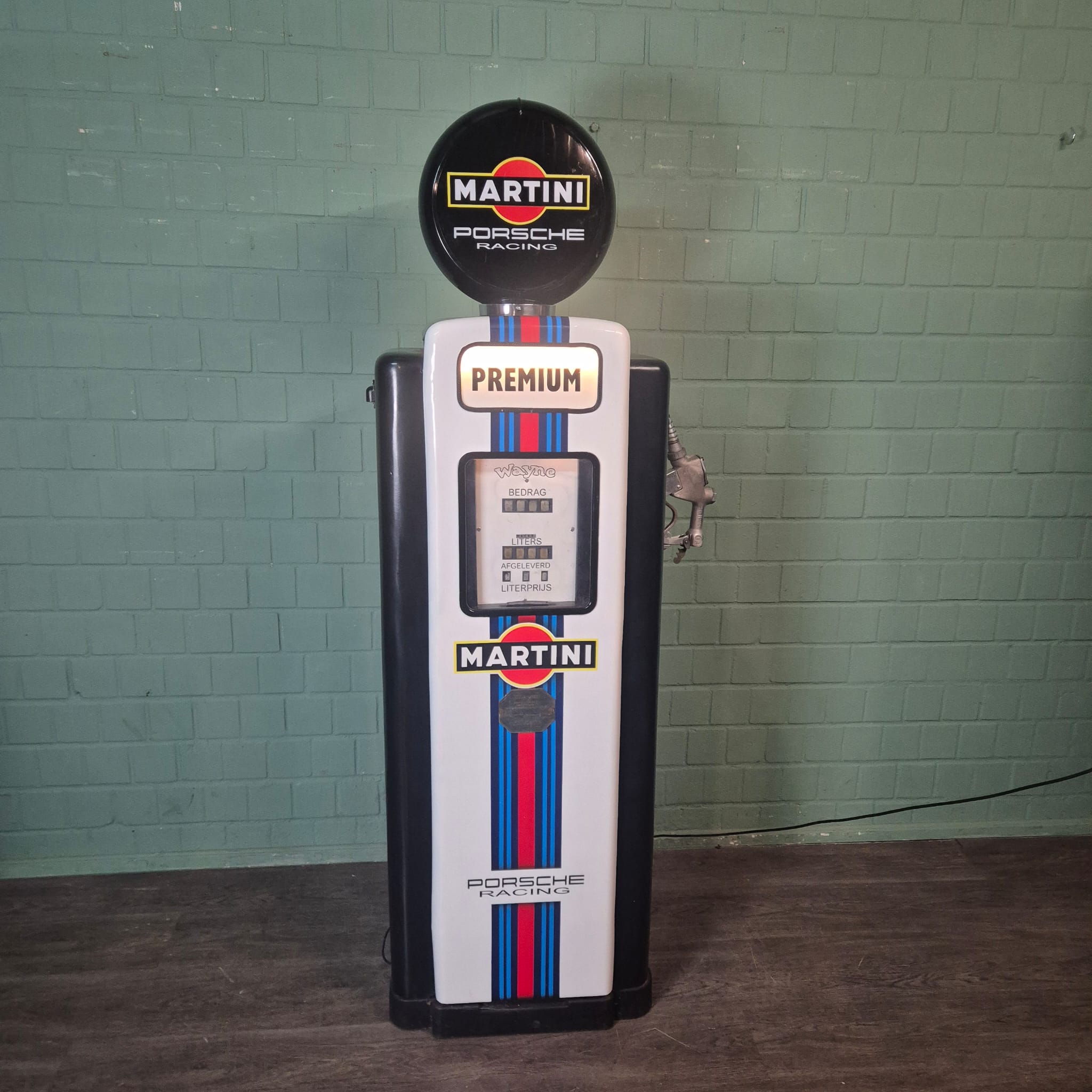 4.999,00€ Ex Tax:Restored Wayne fuel pump from the 1950s in Martini Porsche Racing livery. The paint pays tribute to the famous Martini Racing design with its characteristic blue, light blue, and red stripes, closely associated with Porsche's motorsport successes (particularly in the 1970s with the Porsche 917). The pump was originally used in the Netherlands and/or for the Dutch market.