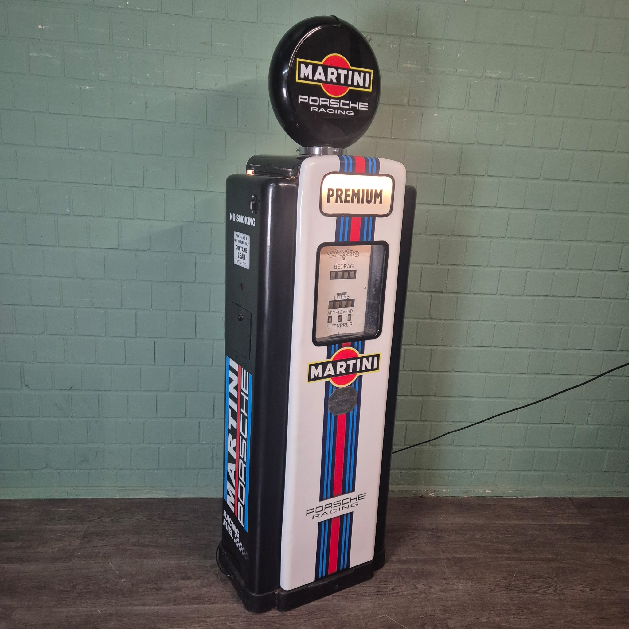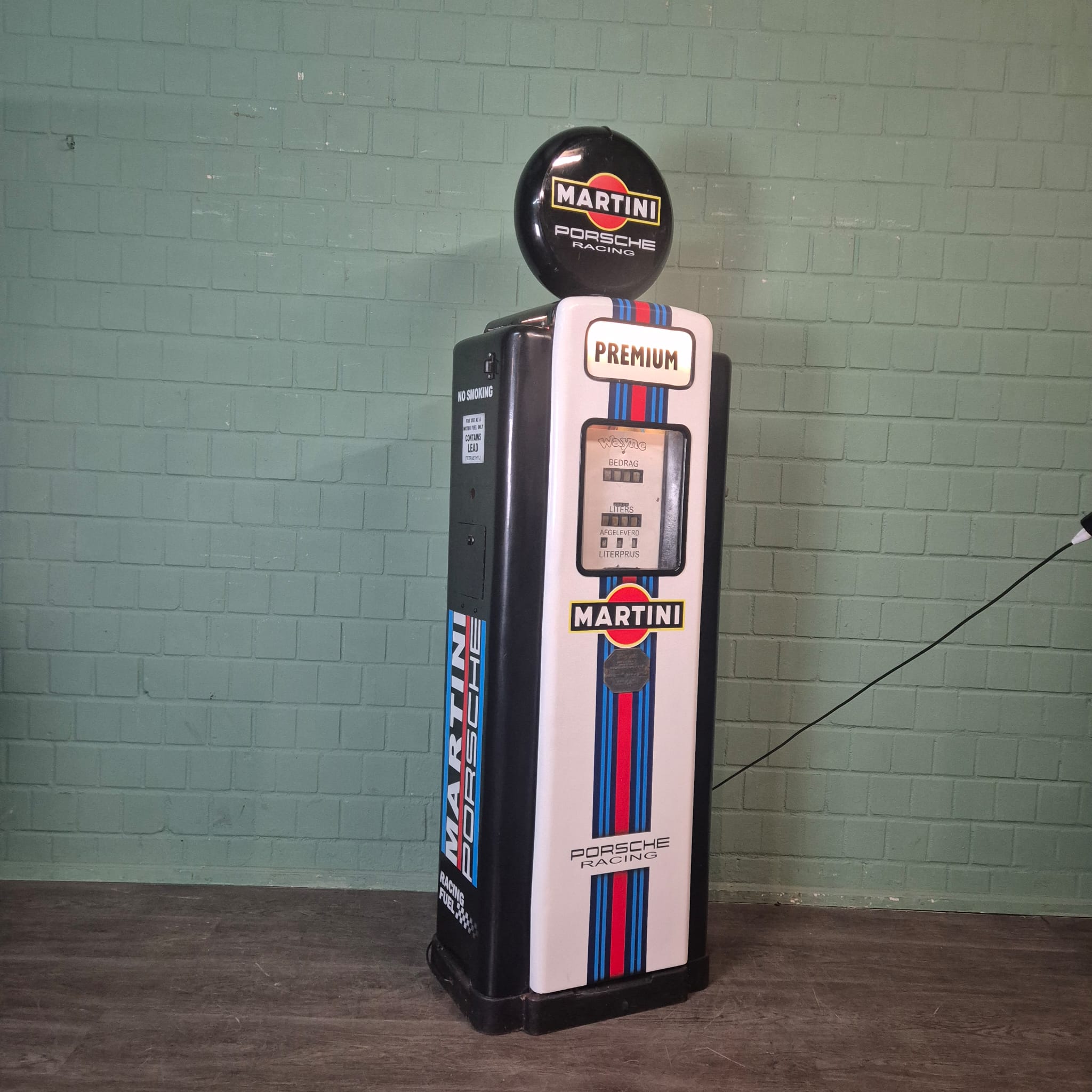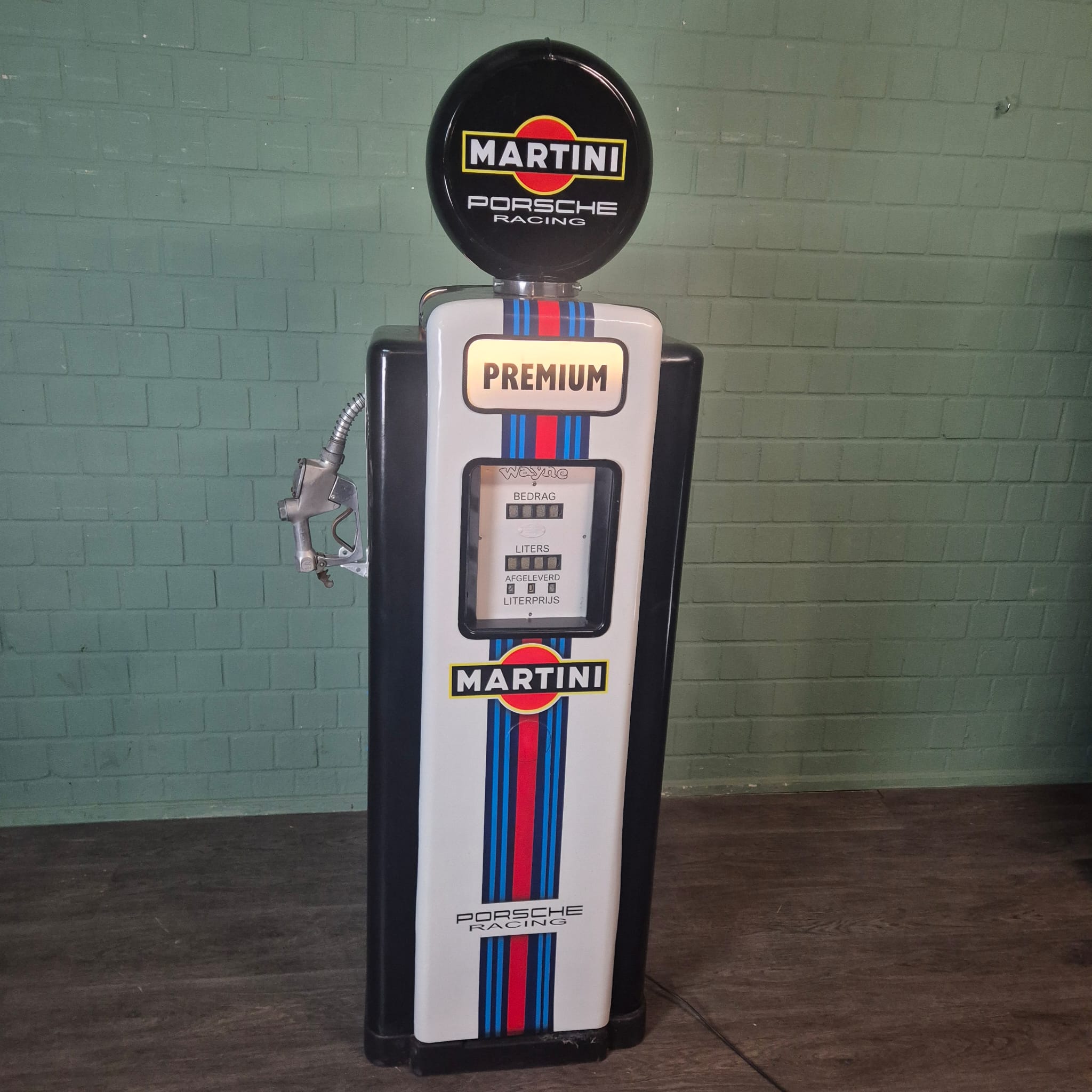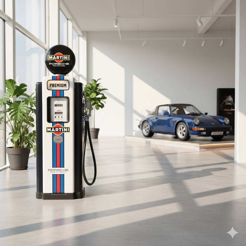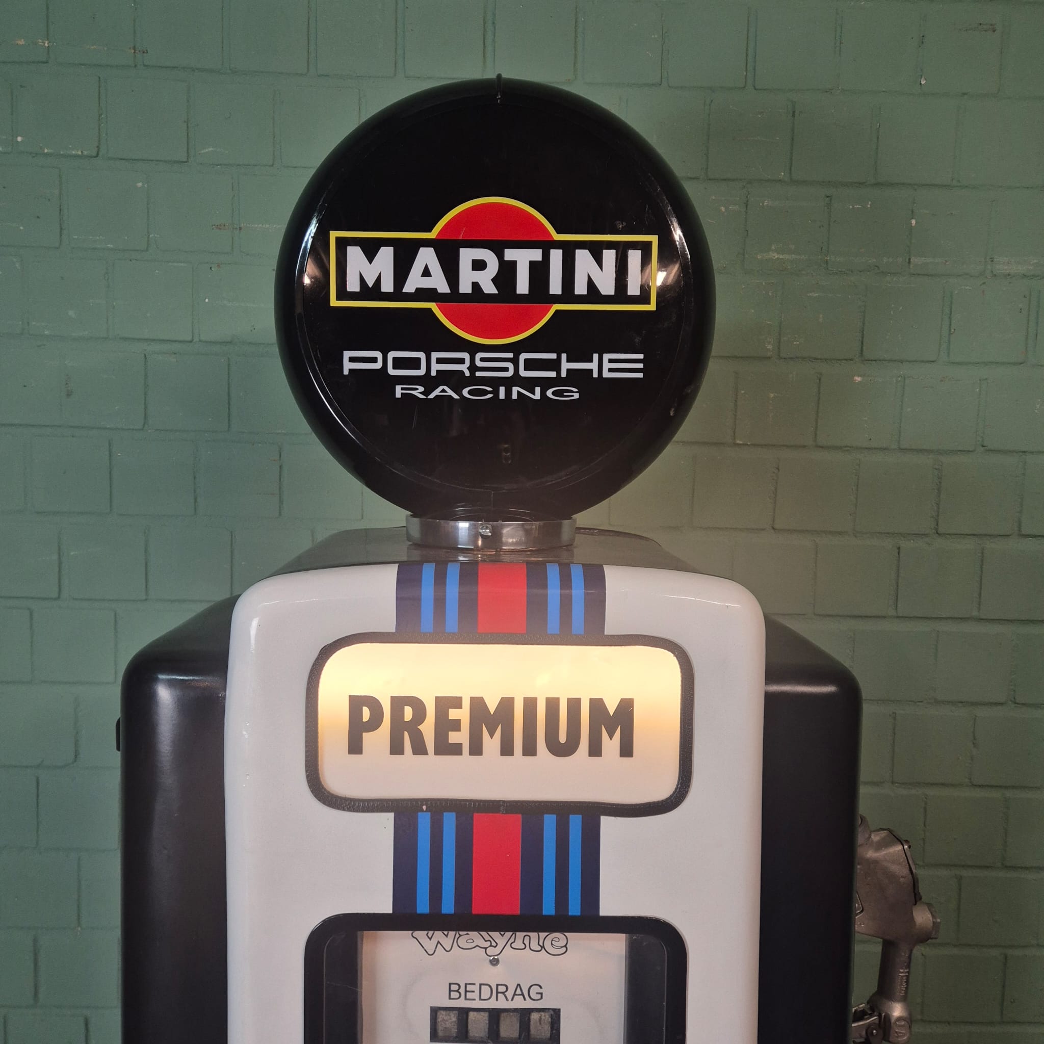 4.999,00€ Ex Tax:Restored Wayne fuel pump from the 1950s in Martini Porsche Racing livery. The paint pays tribute to the famous Martini Racing design with its characteristic blue, light blue, and red stripes, closely associated with Porsche's motorsport successes (particularly in the 1970s with the Porsche 917). The pump was originally used in the Netherlands and/or for the Dutch market.