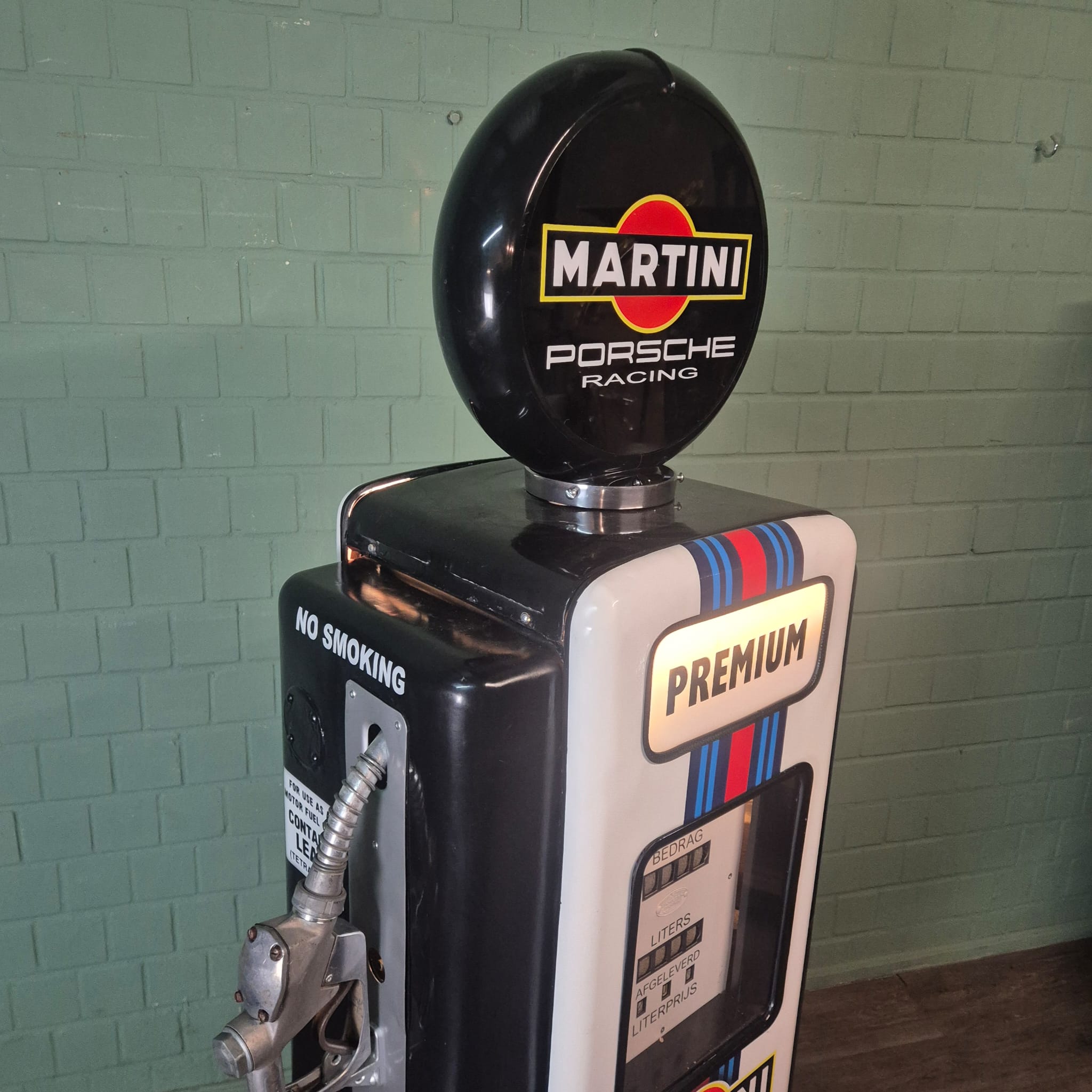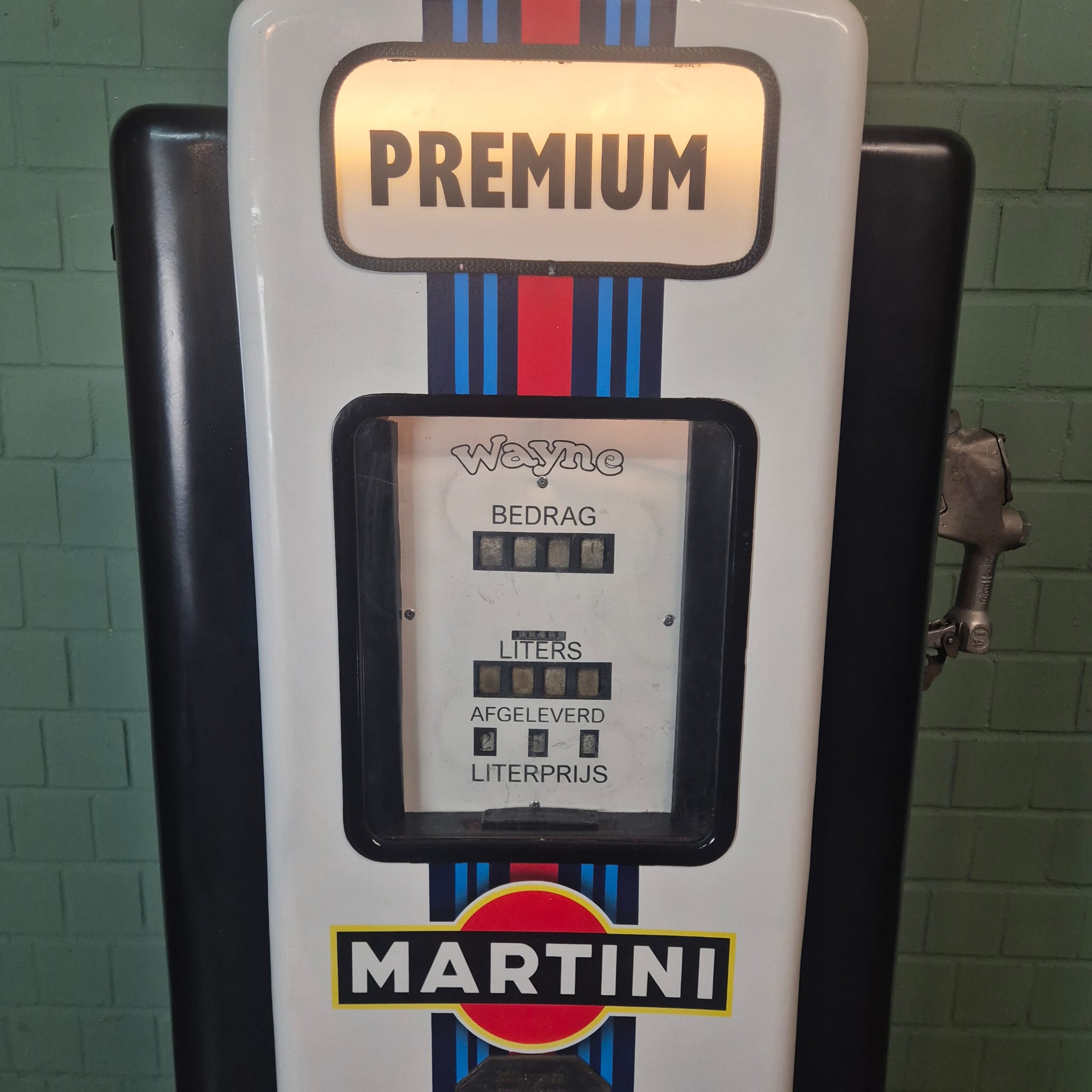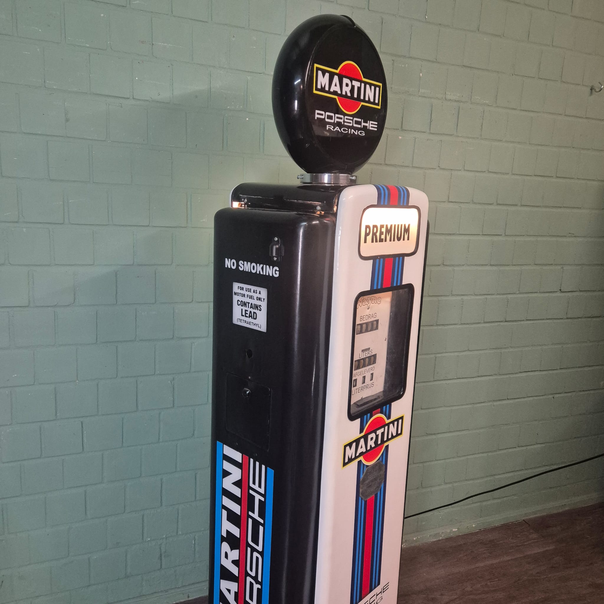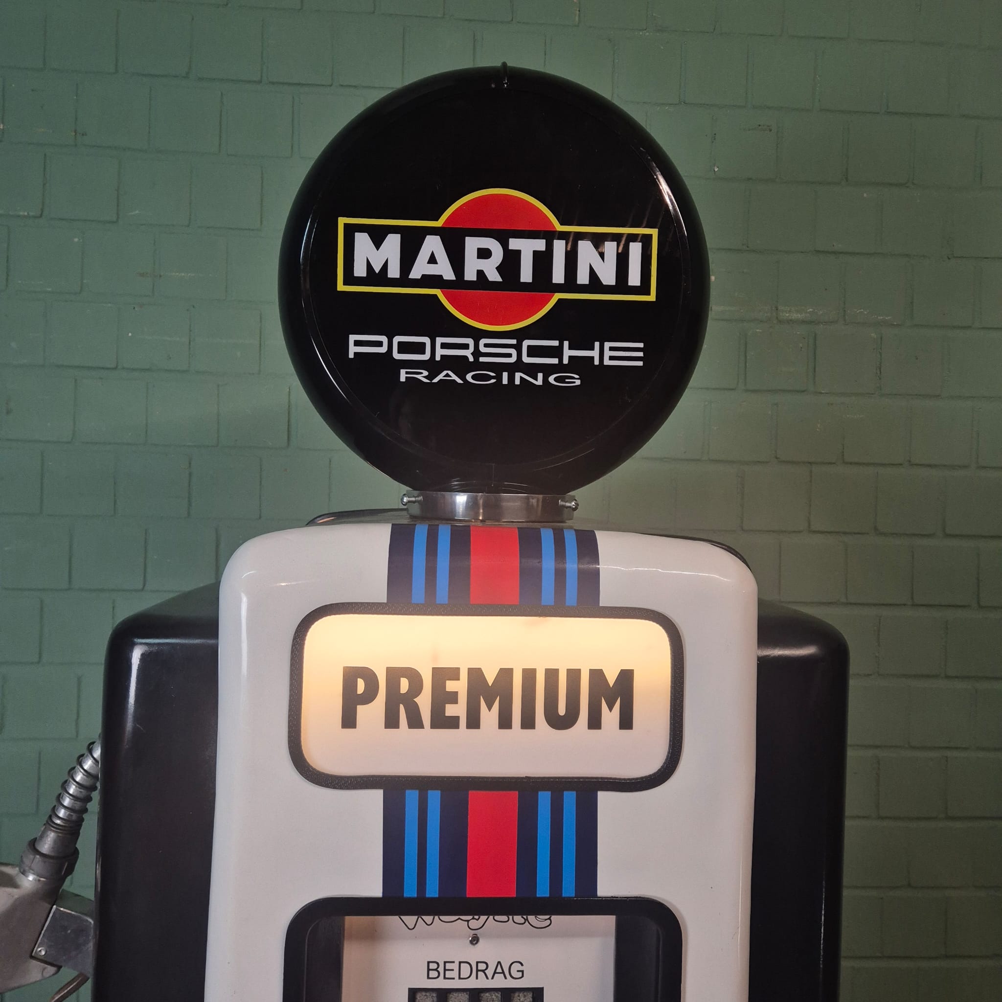 4.999,00€ Ex Tax:Restored Wayne fuel pump from the 1950s in Martini Porsche Racing livery. The paint pays tribute to the famous Martini Racing design with its characteristic blue, light blue, and red stripes, closely associated with Porsche's motorsport successes (particularly in the 1970s with the Porsche 917). The pump was originally used in the Netherlands and/or for the Dutch market.