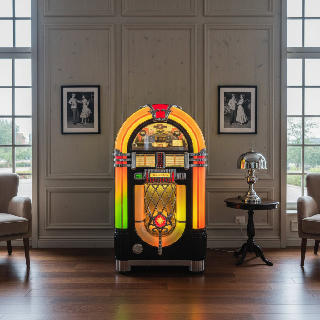 This second-hand jukebox from the 90s pays homage to the iconic Wurlitzer 1015 from 1946. With its classic design and the fascinating light effects of the bubble tubes and color cylinders, it transports you straight to the golden age of rock 'n' roll. Enjoy up to 100 of your favorite songs in first-class sound quality. An absolute highlight for any collection!